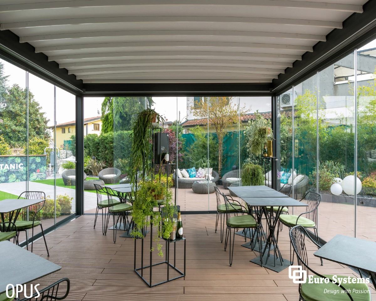 The benefits of having a retractable pergola like our Opus system is that is extremely easy to open and close. Its fabric roof automatically retracts to make the air and sun pass smoothly when weather is moderate or at night during the summertime, allowing your customers to enjoy a great outdoor dining experience.
