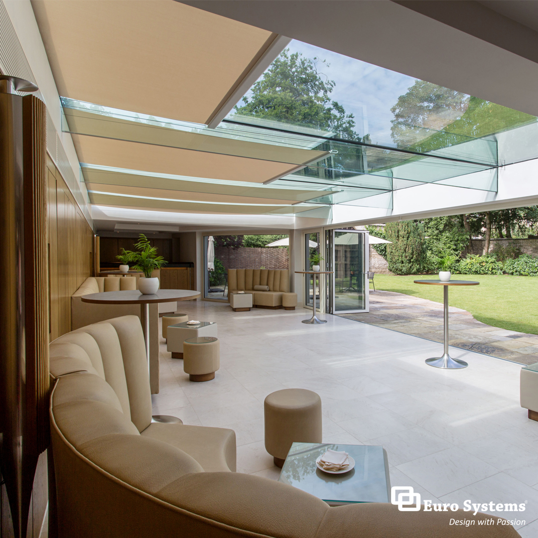 The Solange® specialty shades from Euro systems® are made-to-measure and can cover large areas suitable for horizontal, curved, and sloping glazed designs. The specialty shades open and close in various directions as needed. The blackout and sunscreen fabrics keep your home cool in the summer and warm in the winter. These fabrics are strong, and durable and provide exceptional heat and glare reduction. Our skylight shading system is equipped with our Serena® motorization which can be connected to almost any home automation system.
