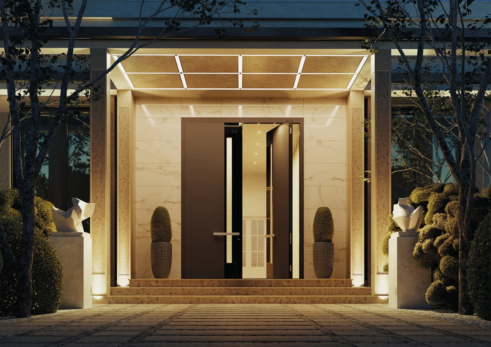 Pivot doors are robust, large, modern, and visually stunning. Pivot doors that are finished in wood or marble are an ideal design element and perfect to increase safety and boost the aesthetics of your entrance.