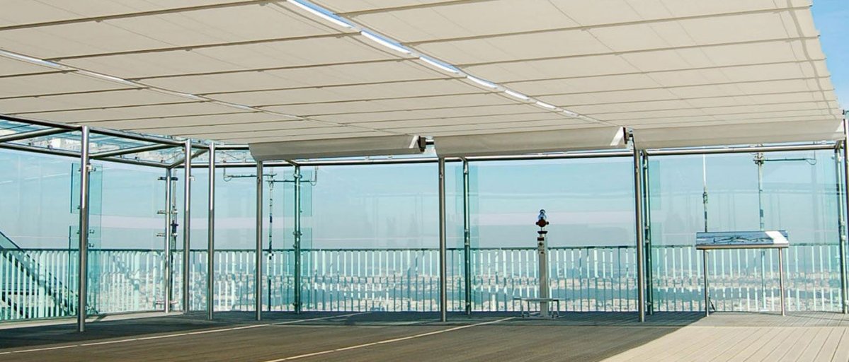 Solange® 500 is the perfect solution to areas with large horizontal glazing as it incorporates a single mechanism that covers up to 100m2. It is typically engineered for covering glazed roofs, plazas and terraces. This horizontal shading system is fixed to each end of the opening with no side fixings required. Available in a rectangular shape, the blind is divided into individual panels which are released and retracted using motorized cables. 6mm stainless steel wires are attached to support bars which use coated steel brackets.