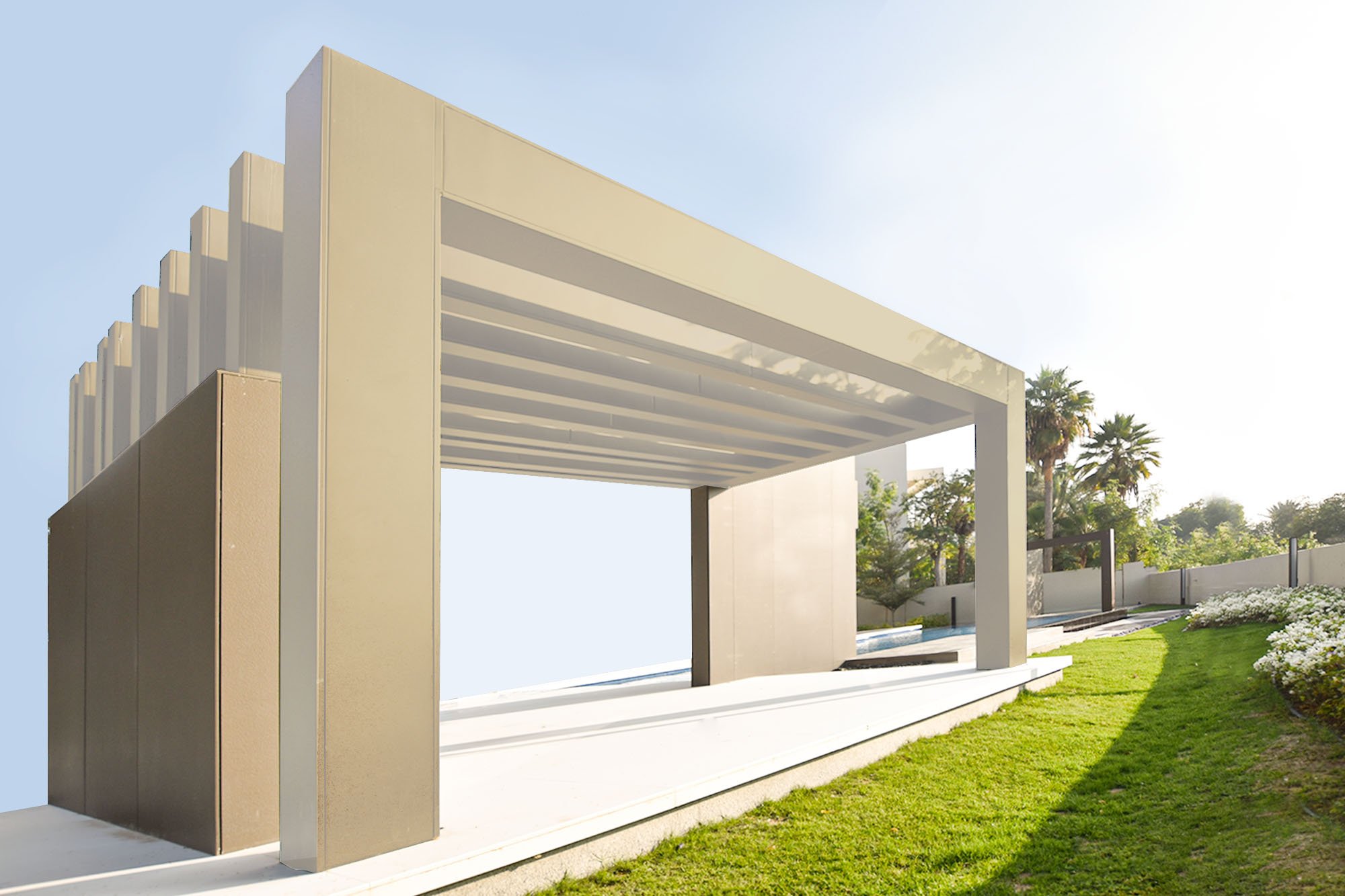 Constructed from extruded aluminum profiles for transformation of outdoor spaces into functional areas.