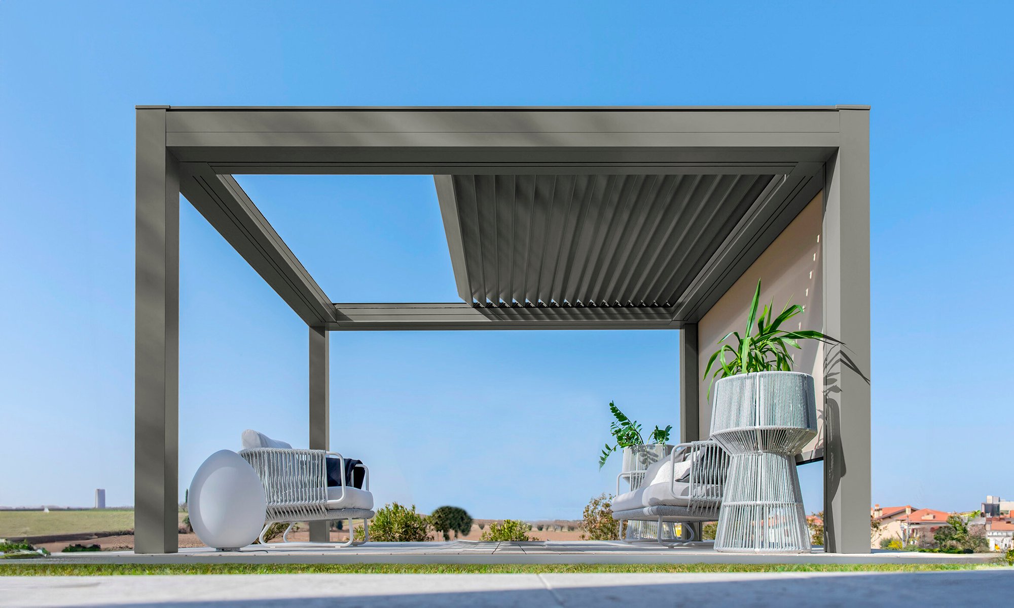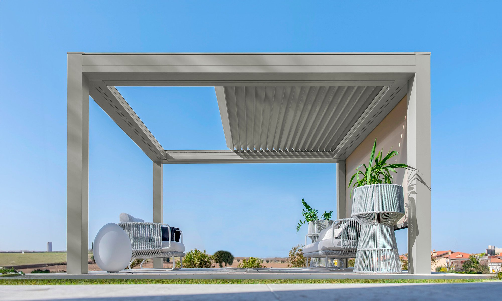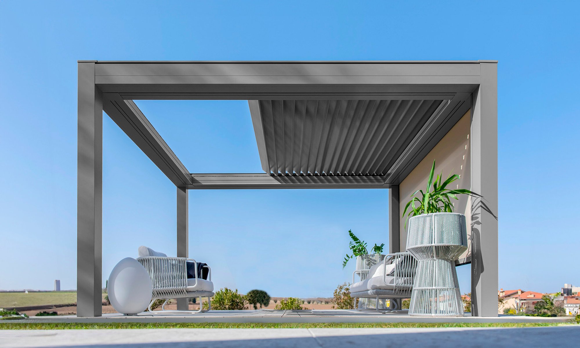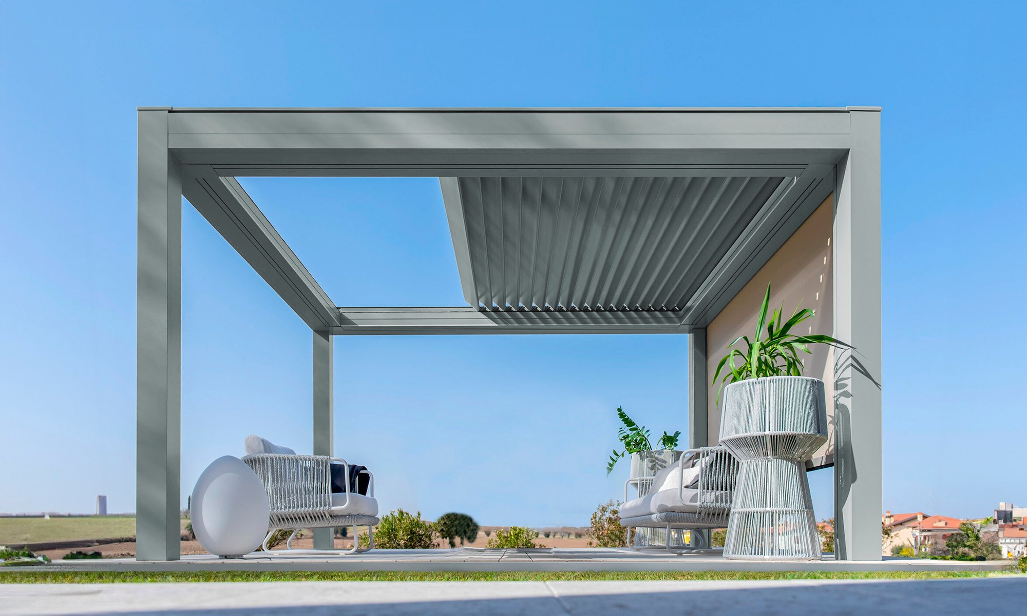 Built with an aluminum frame, it incorporates a rotating louver-retractable roof system, enabling users to adjust light intensity and ventilation. With a single smooth movement, the louvers rotate and retract simultaneously for optimal comfort. Its clean aesthetic, without visible bolts, and endless modularity in width and projection set it apart in modern outdoor architecture