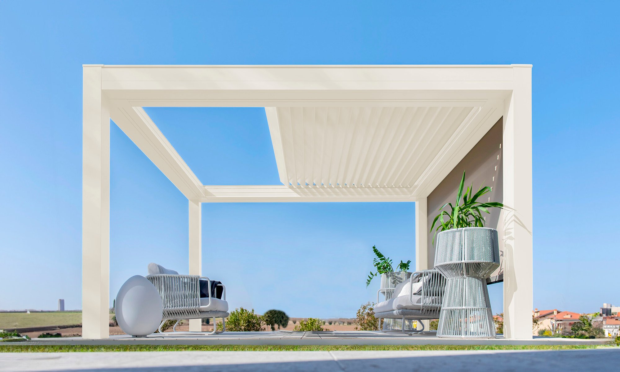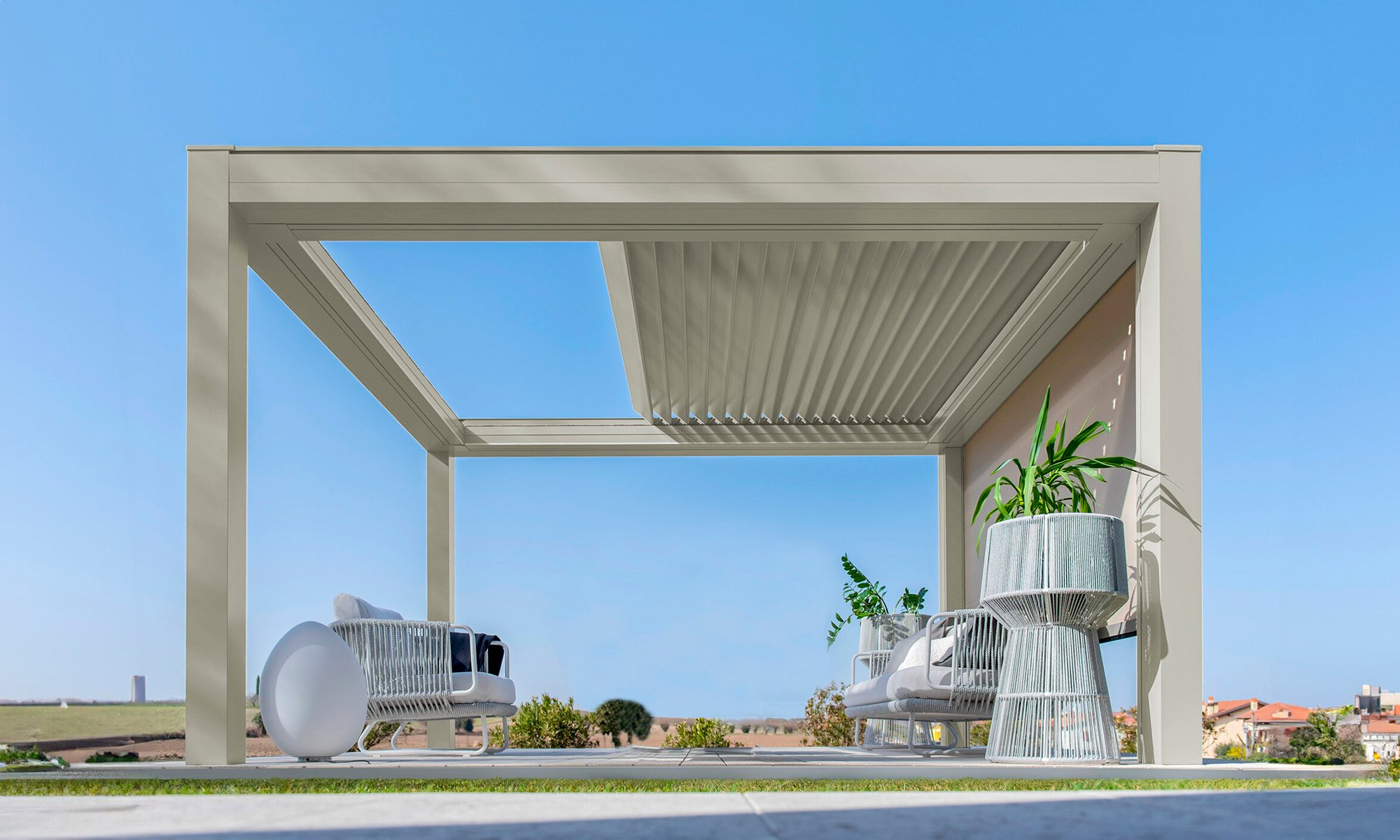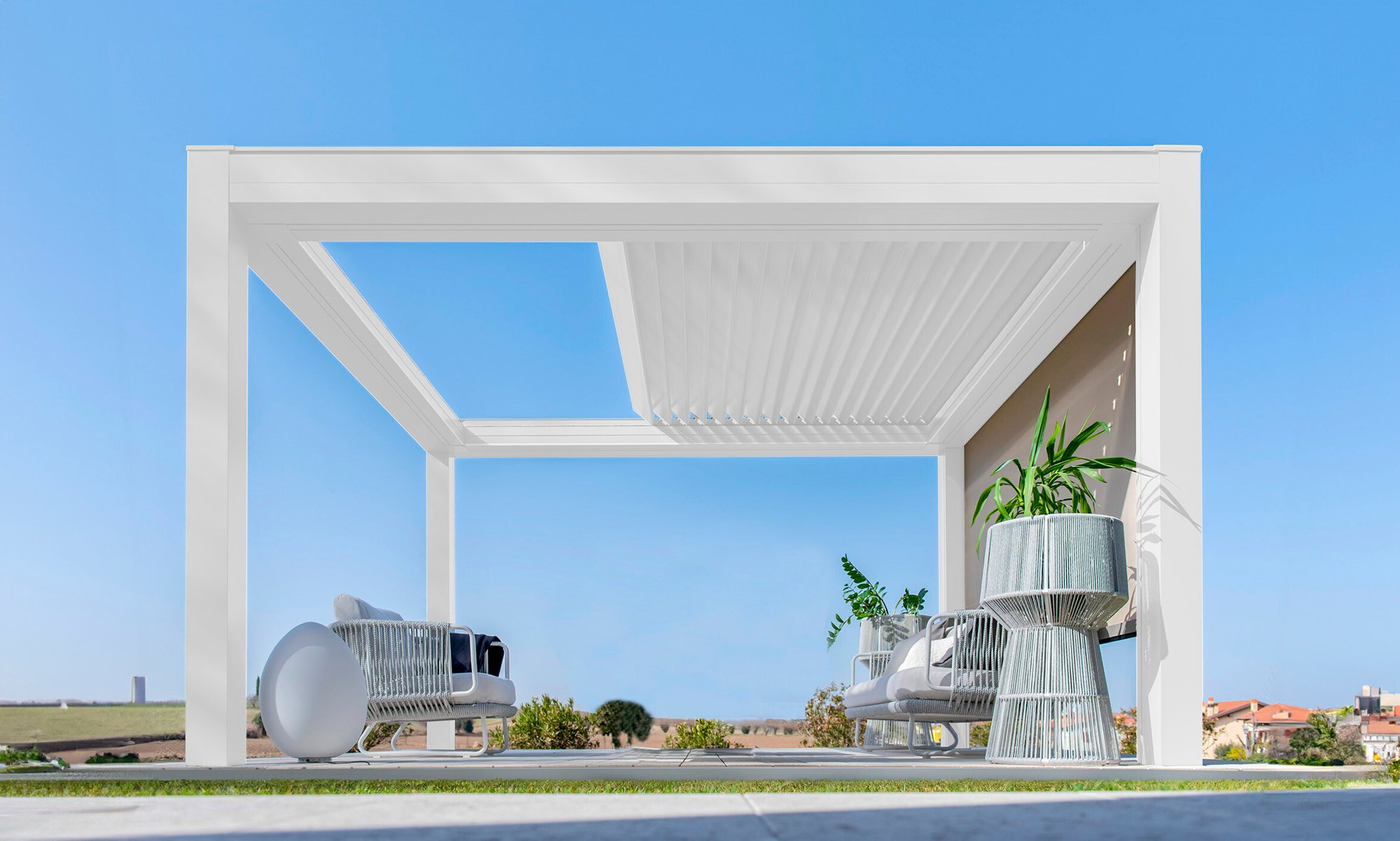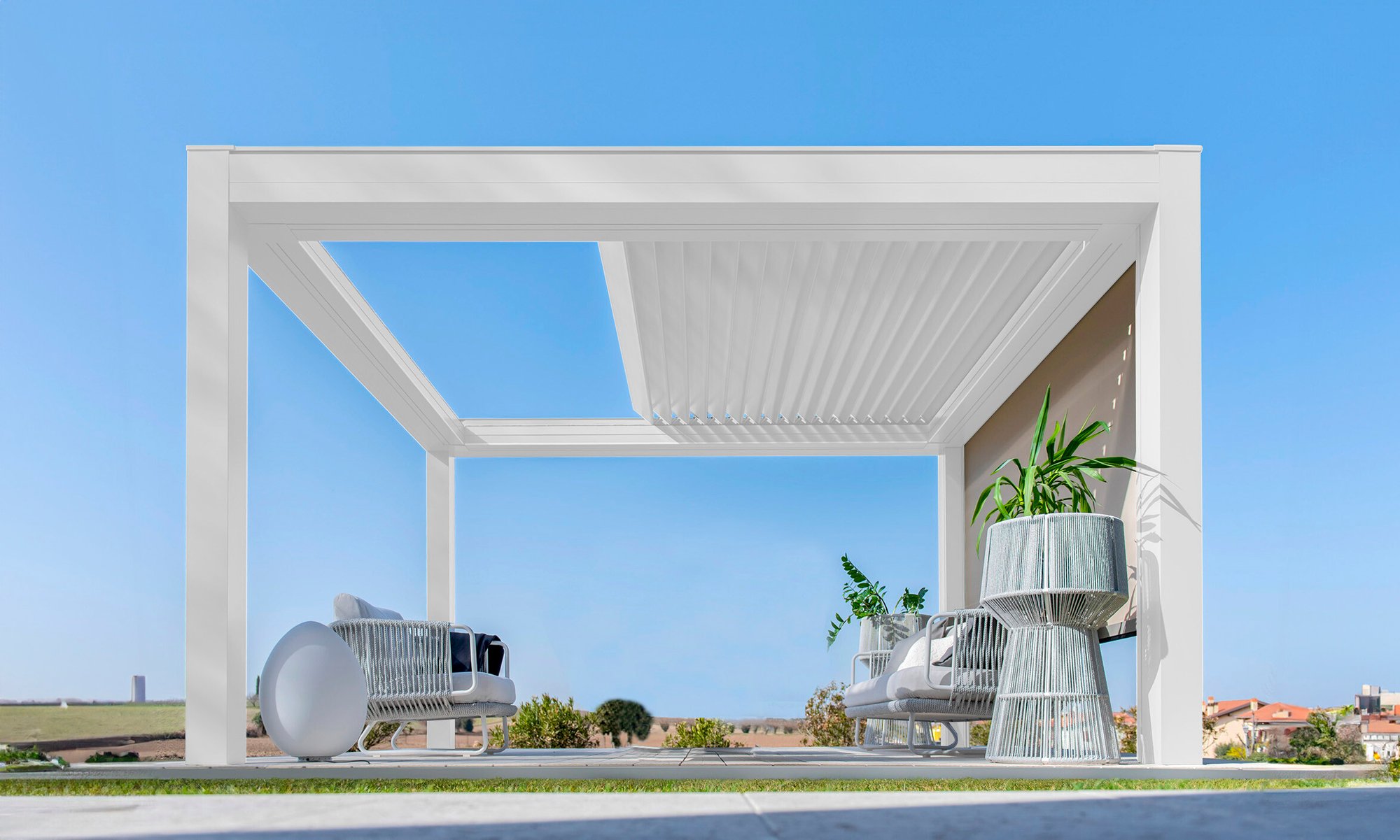 Built with an aluminum frame, it incorporates a rotating louver-retractable roof system, enabling users to adjust light intensity and ventilation. With a single smooth movement, the louvers rotate and retract simultaneously for optimal comfort. Its clean aesthetic, without visible bolts, and endless modularity in width and projection set it apart in modern outdoor architecture