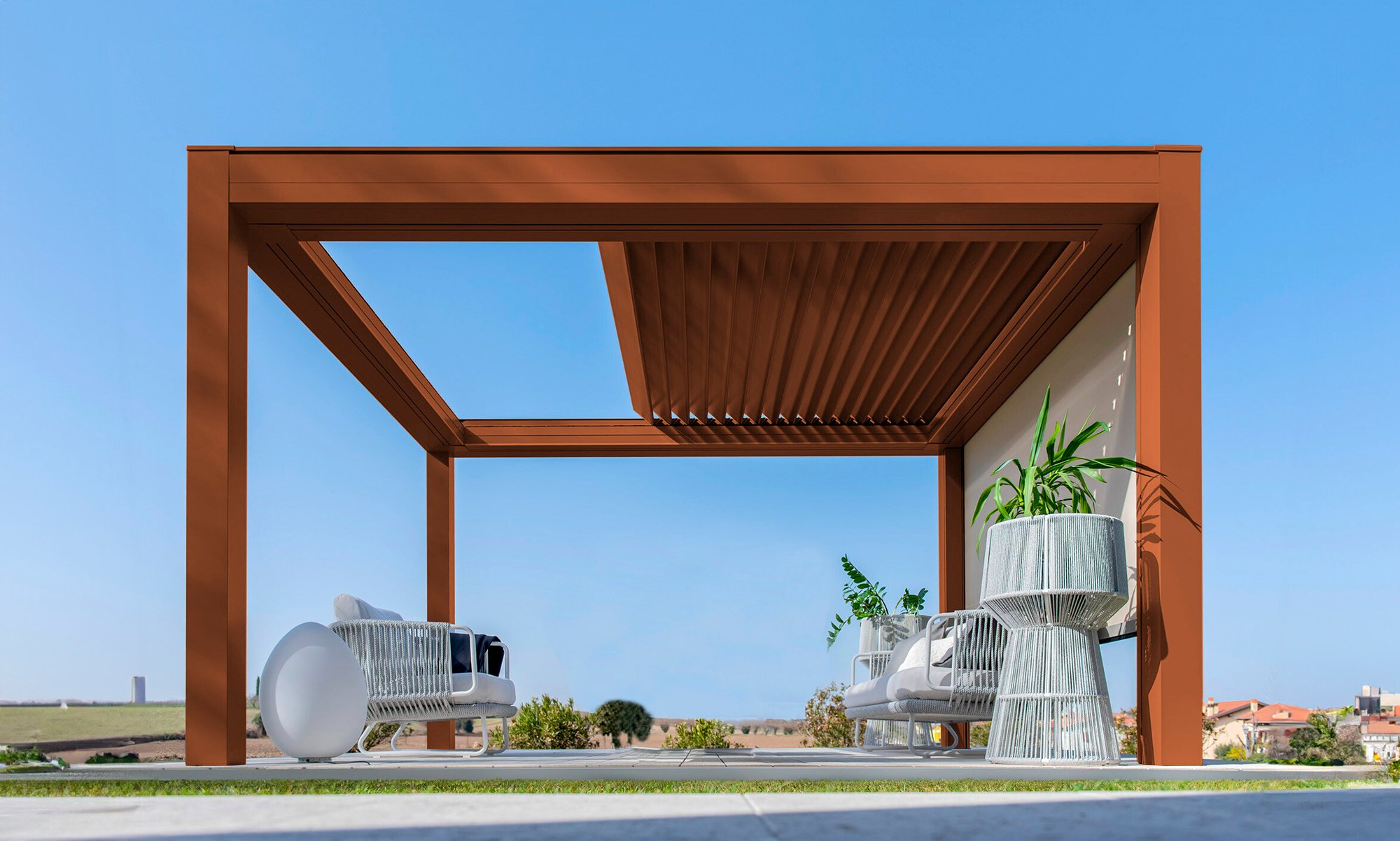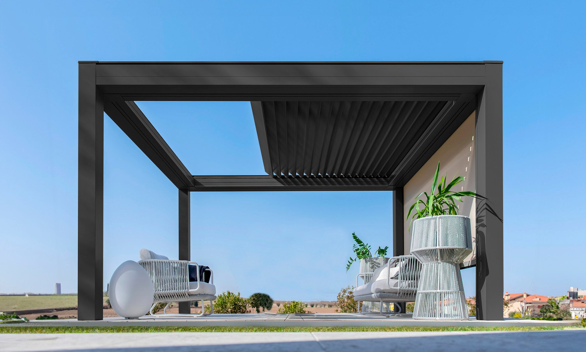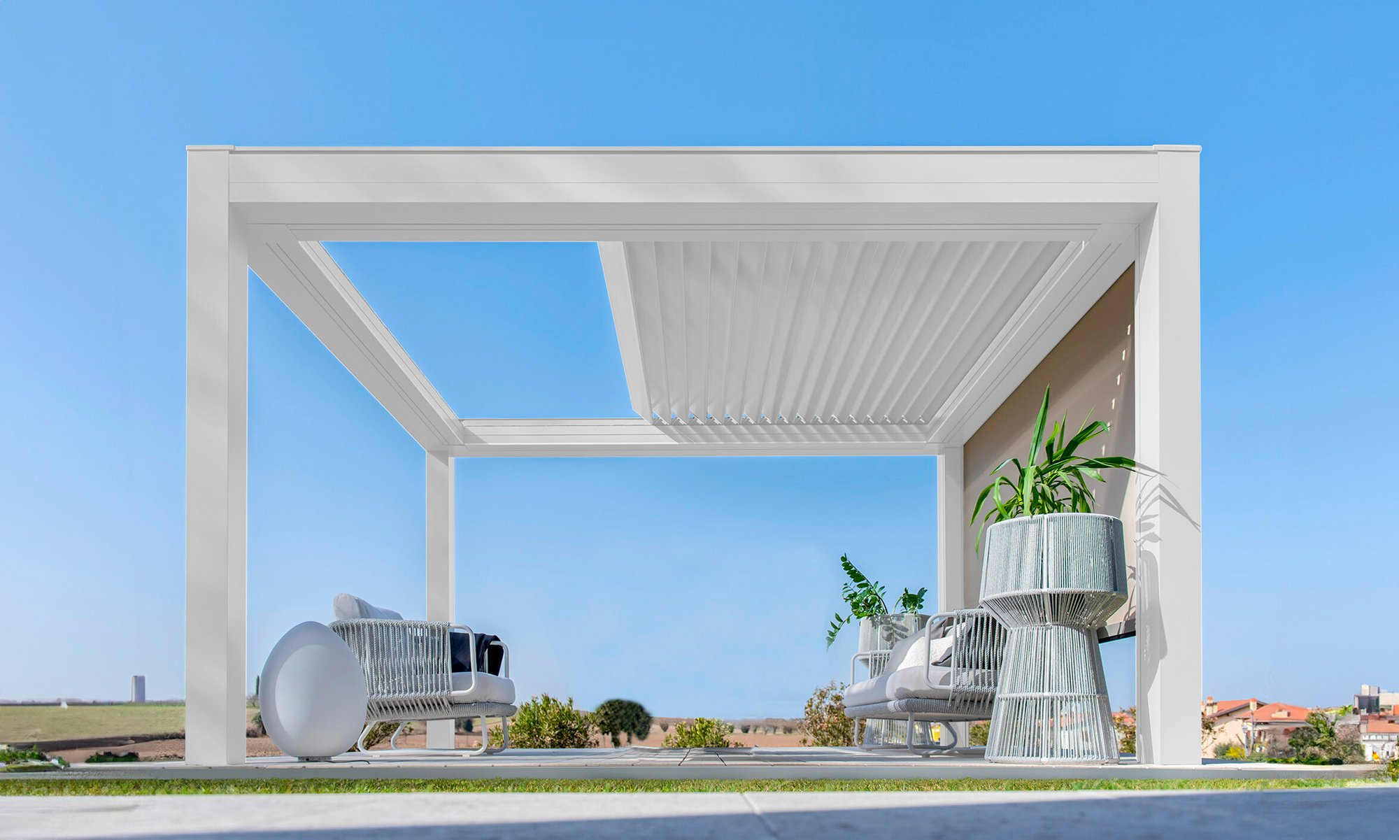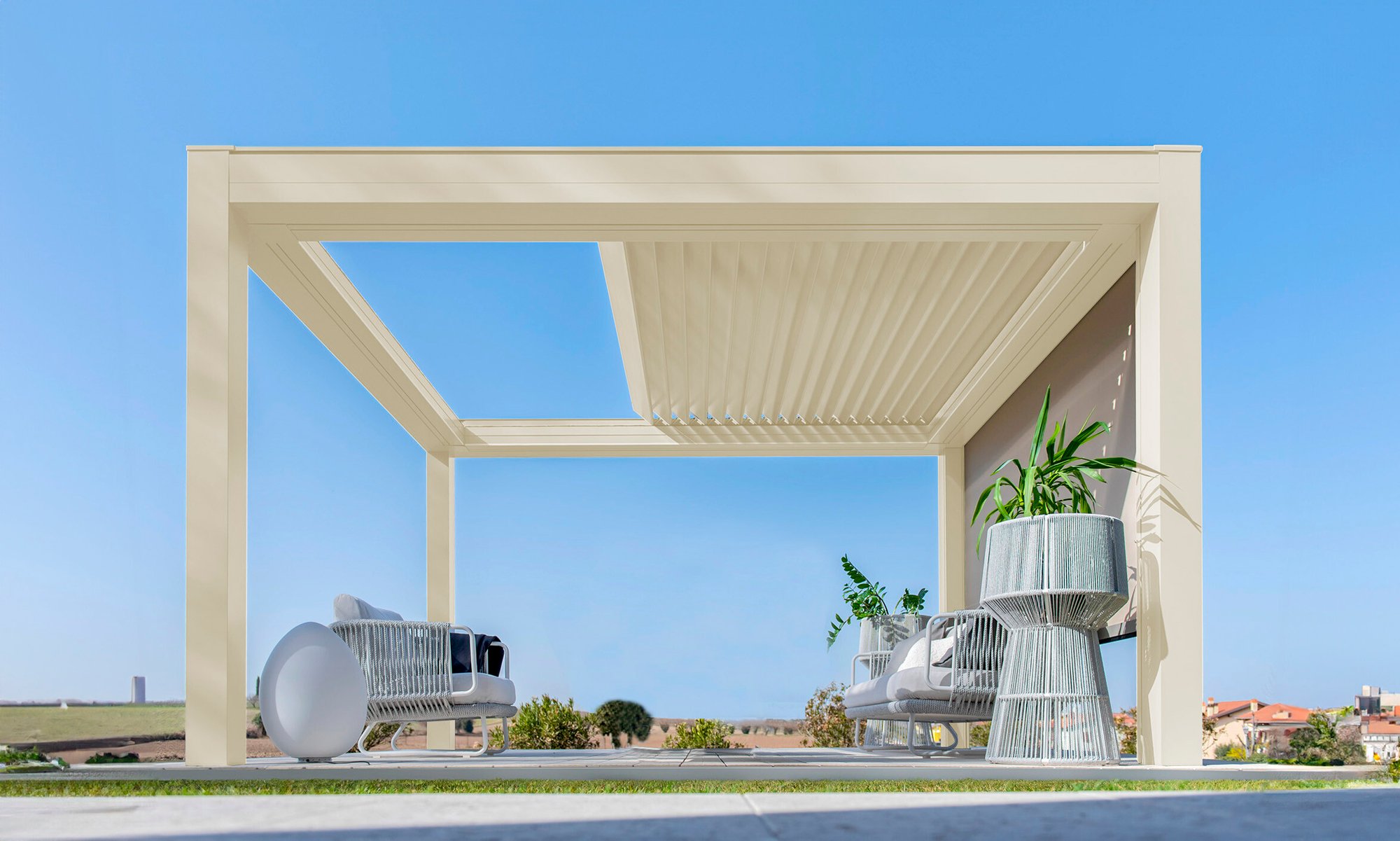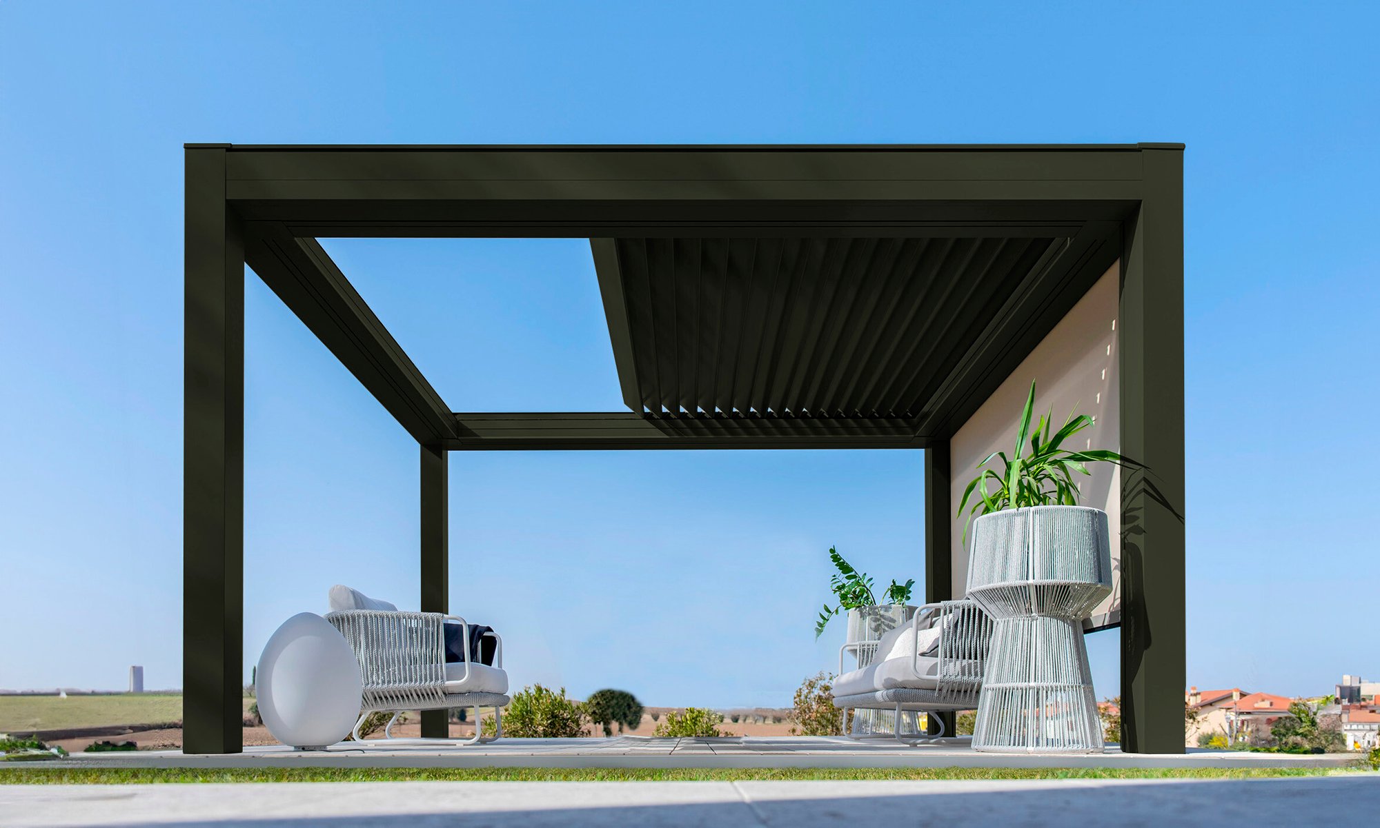 Built with an aluminum frame, it incorporates a rotating louver-retractable roof system, enabling users to adjust light intensity and ventilation. With a single smooth movement, the louvers rotate and retract simultaneously for optimal comfort. Its clean aesthetic, without visible bolts, and endless modularity in width and projection set it apart in modern outdoor architecture