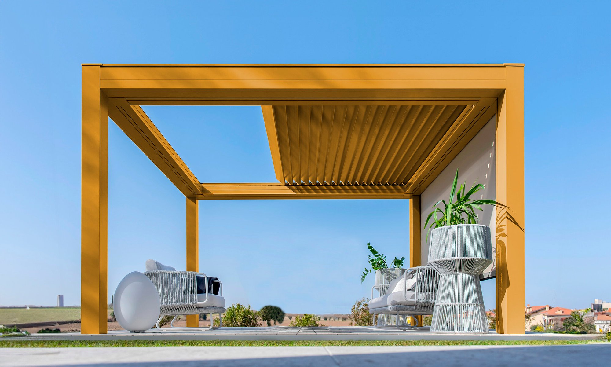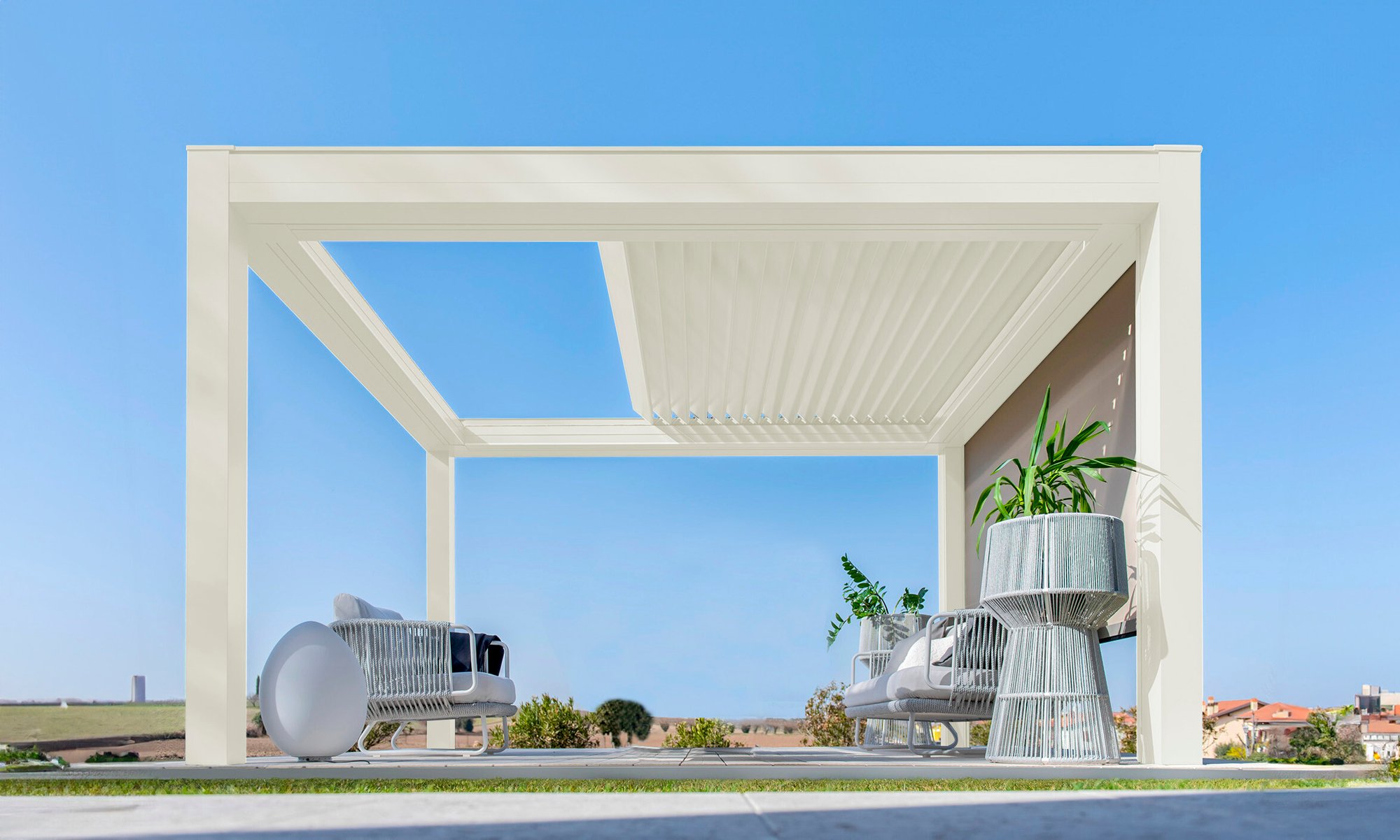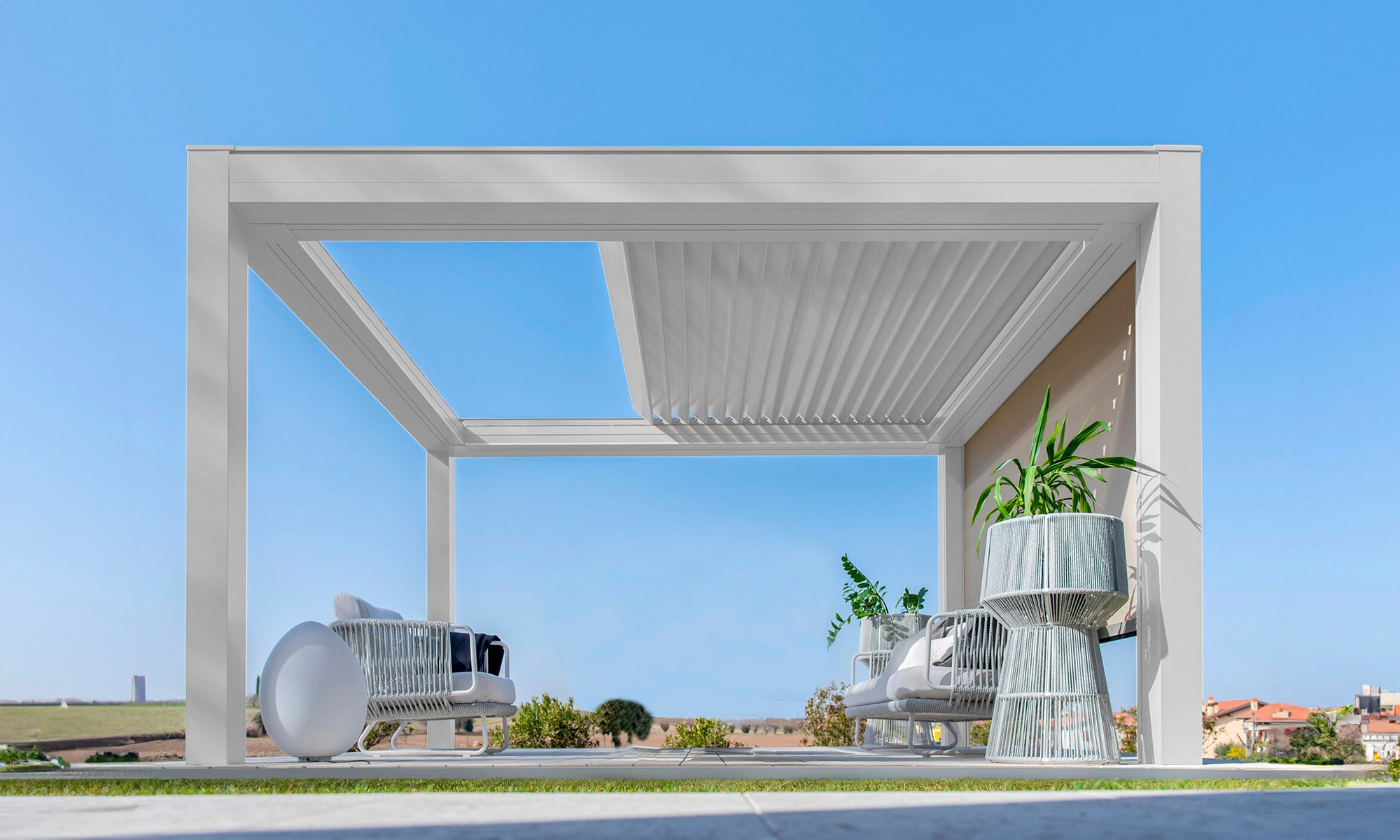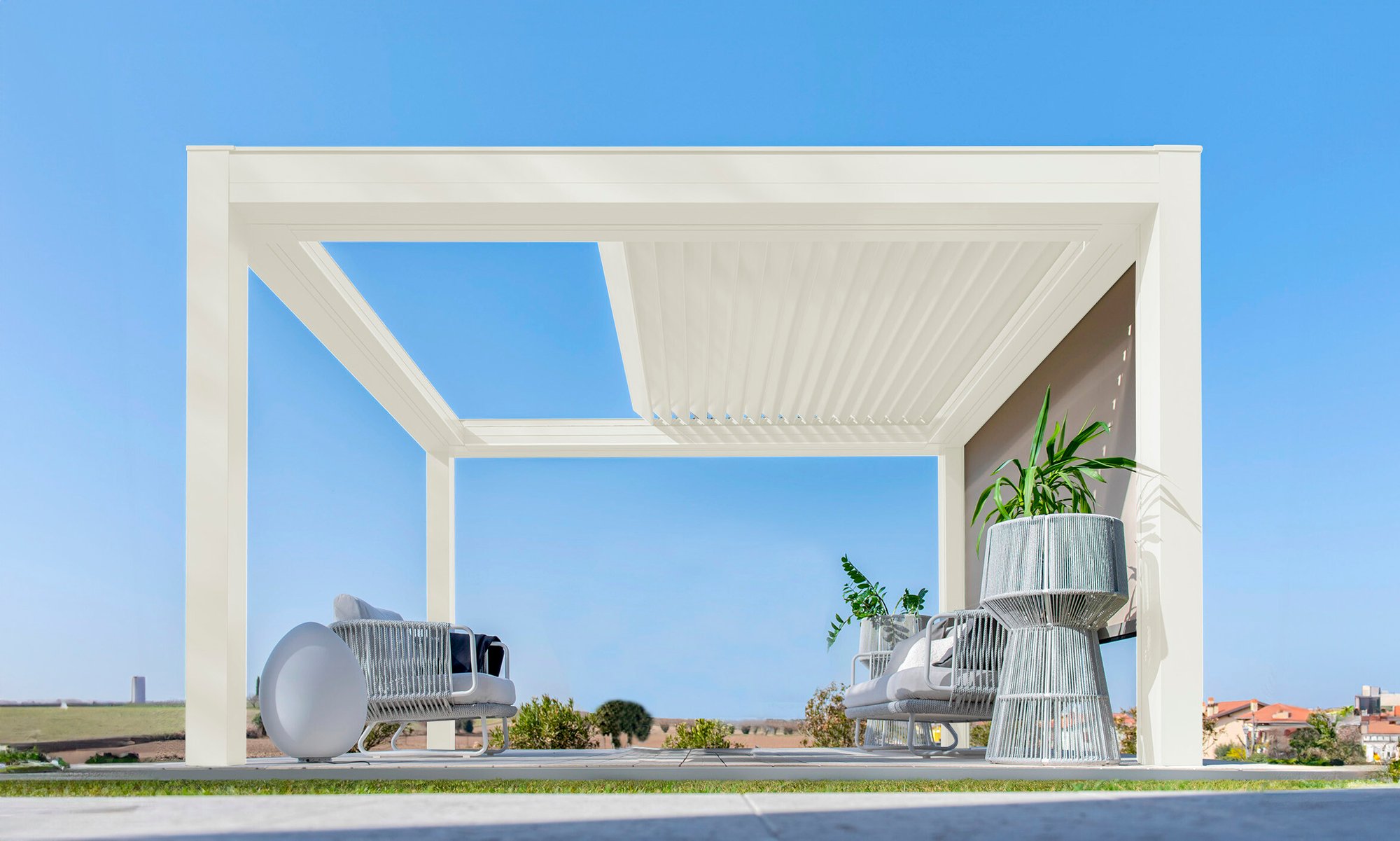 Built with an aluminum frame, it incorporates a rotating louver-retractable roof system, enabling users to adjust light intensity and ventilation. With a single smooth movement, the louvers rotate and retract simultaneously for optimal comfort. Its clean aesthetic, without visible bolts, and endless modularity in width and projection set it apart in modern outdoor architecture