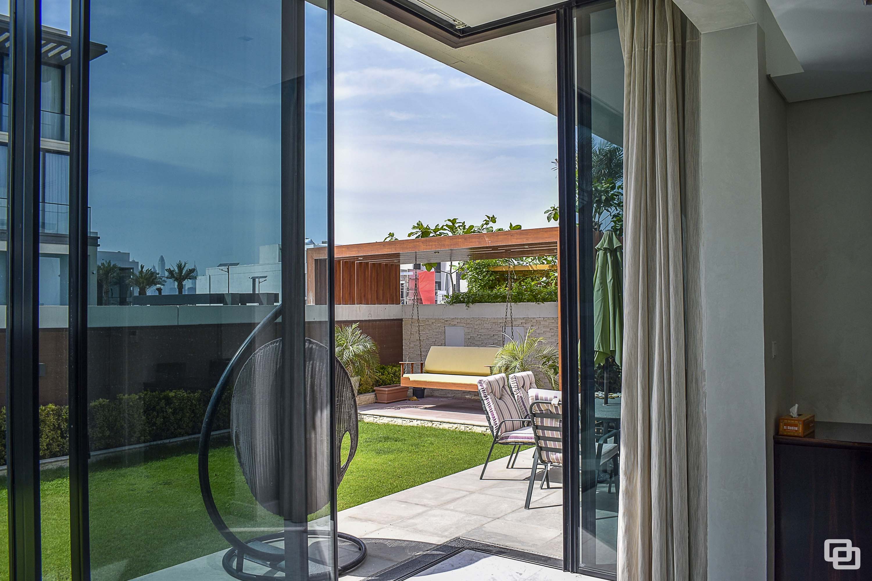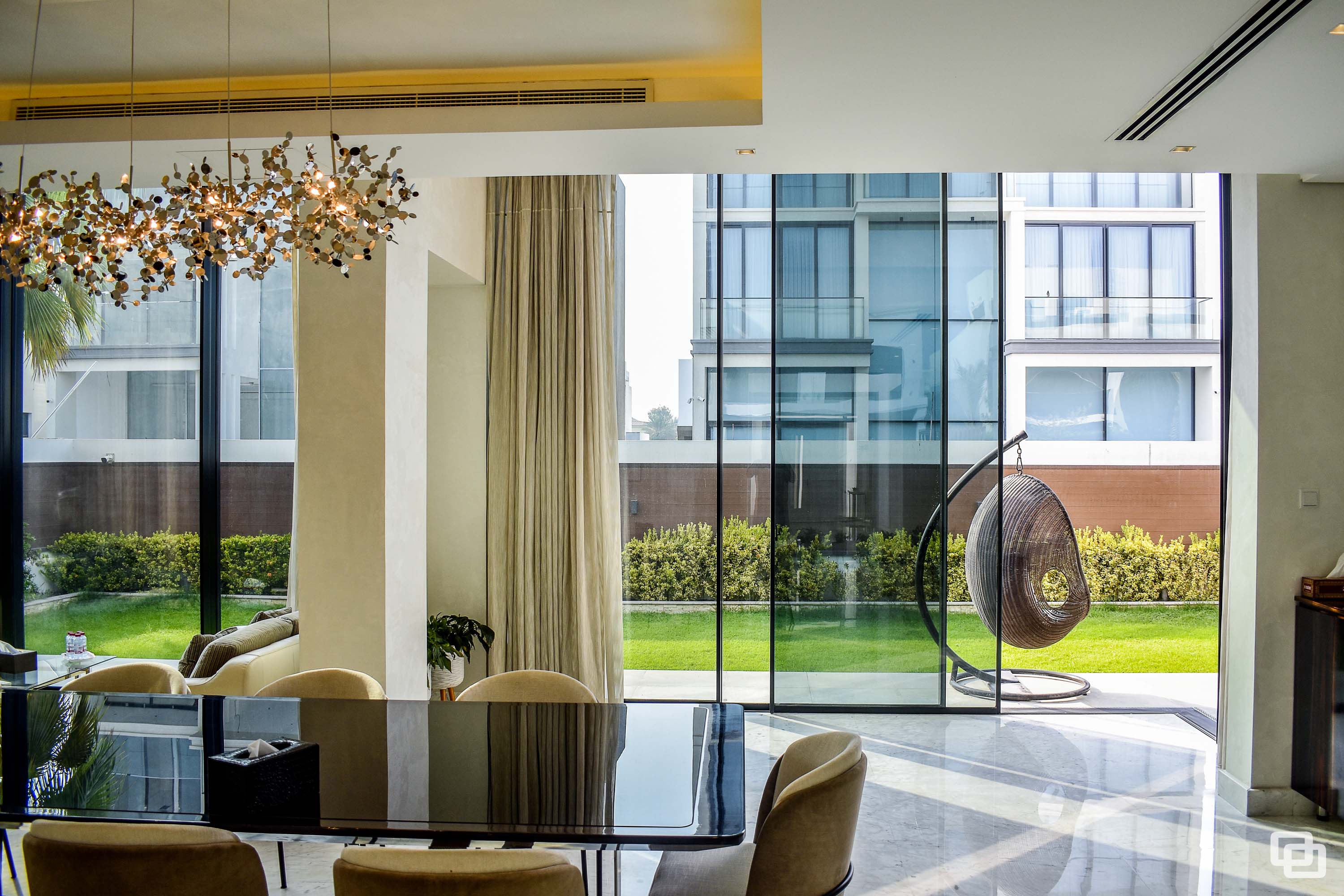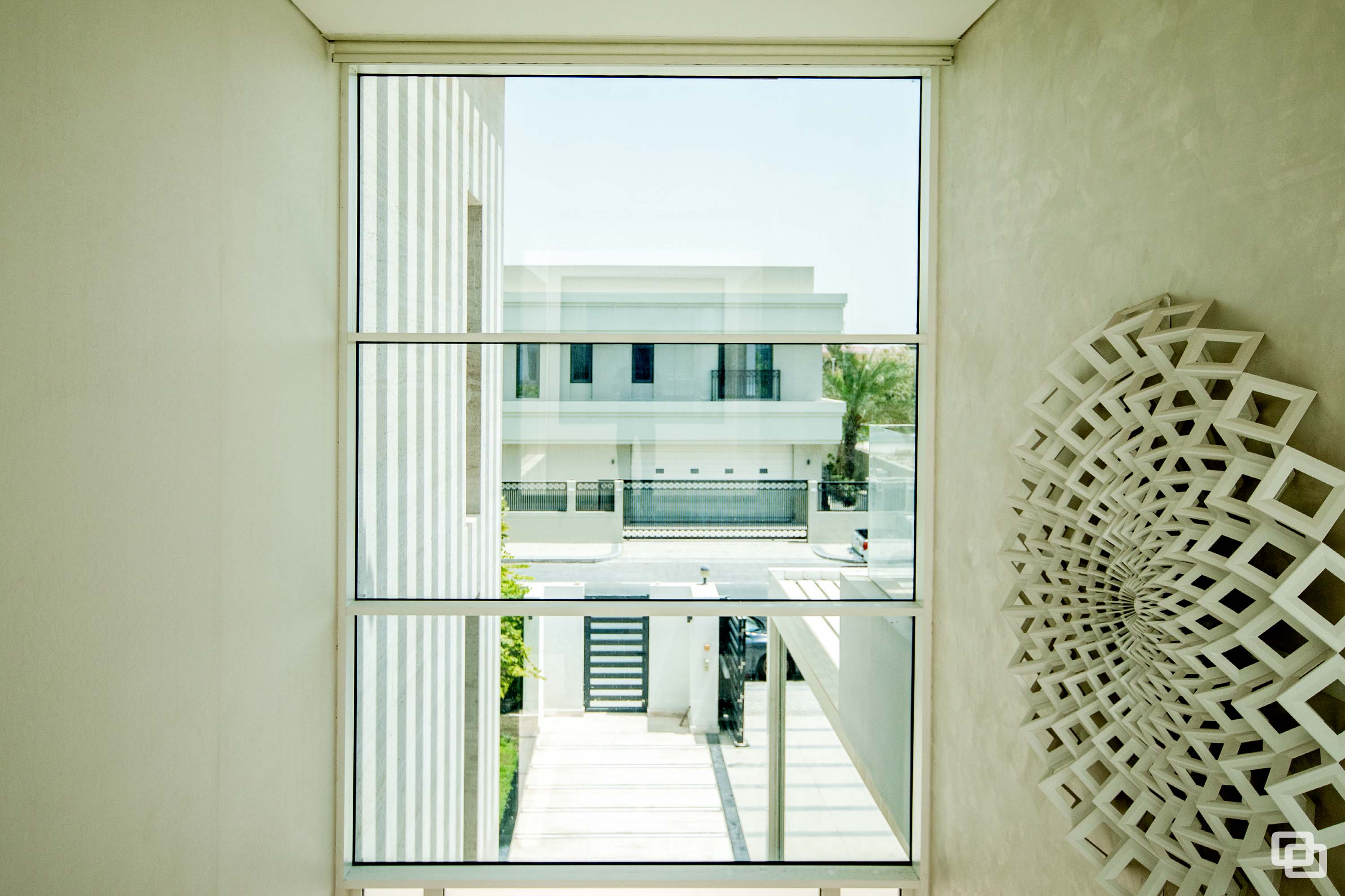 This private villa located in Jumeirah Park, Dubai, has been installed with bespoke architectural systems such as Gracili Minimal Systems®, and Acoustic Ceiling. We specialize in acoustic solutions for private residential villas. Roller Blind Sunscreen Fabric : Venice 5001