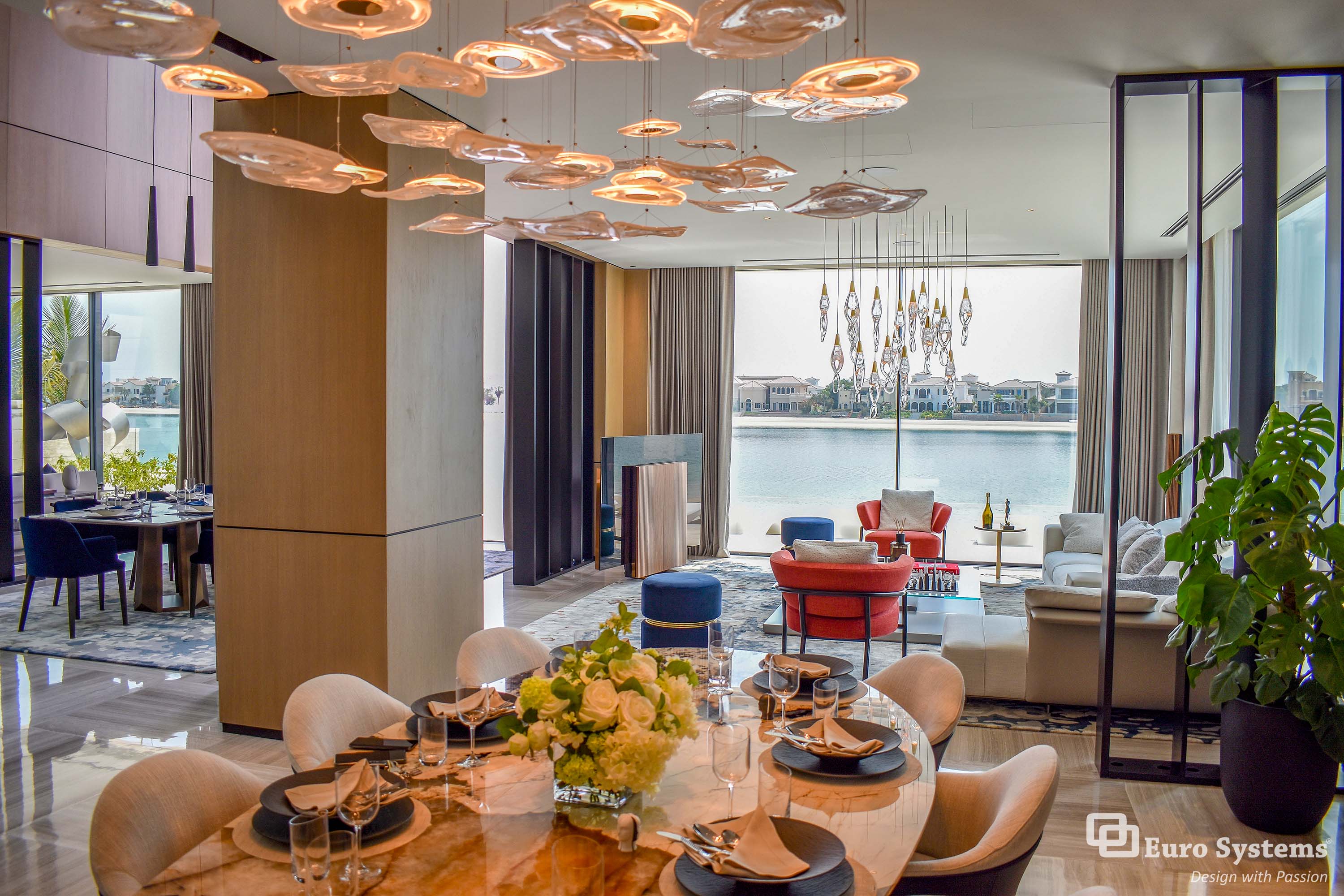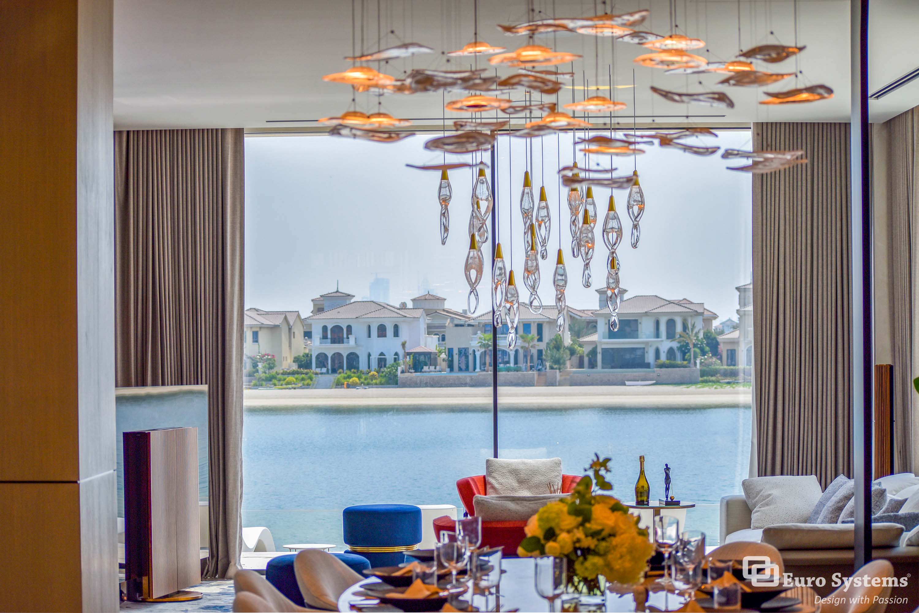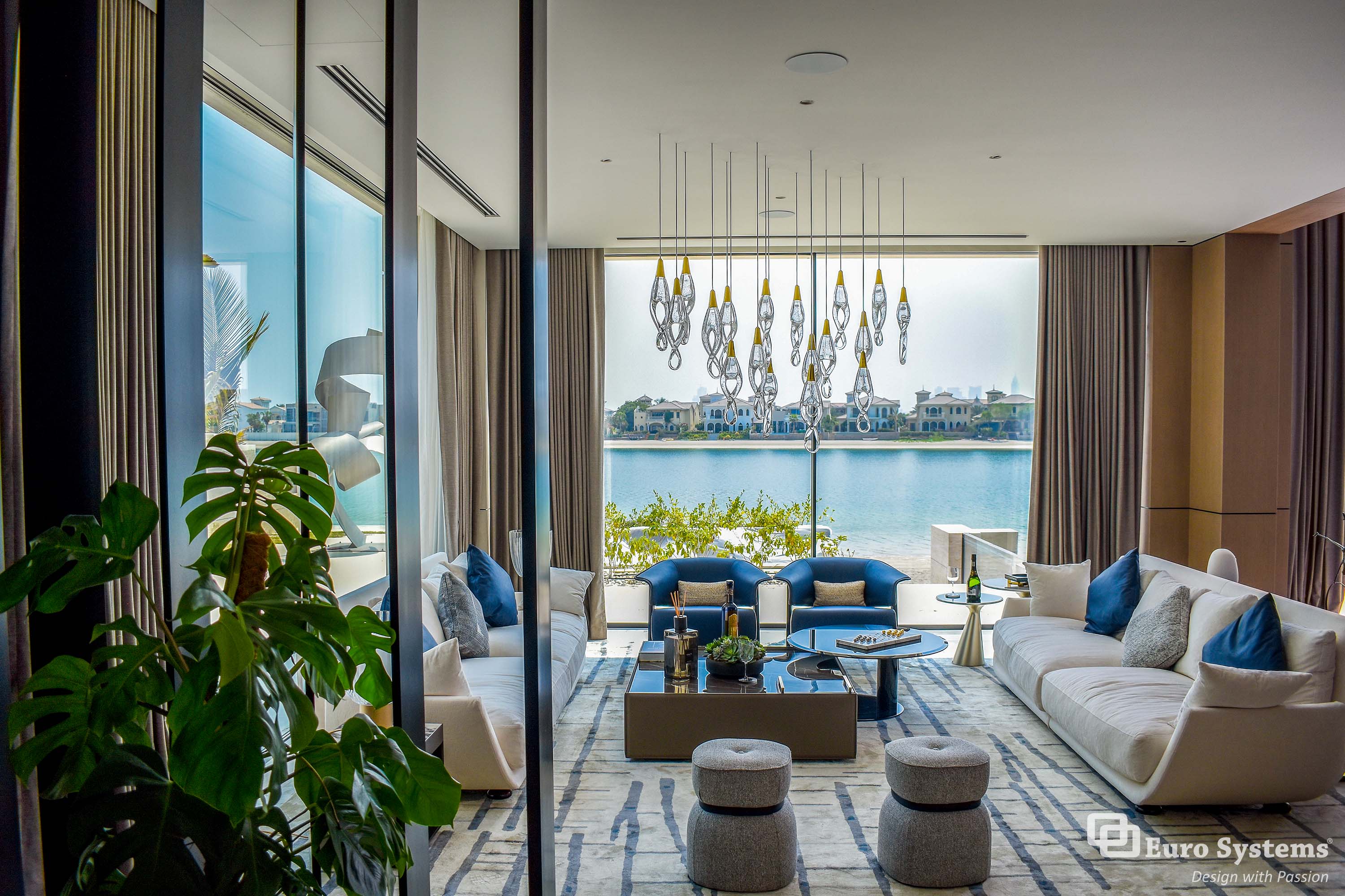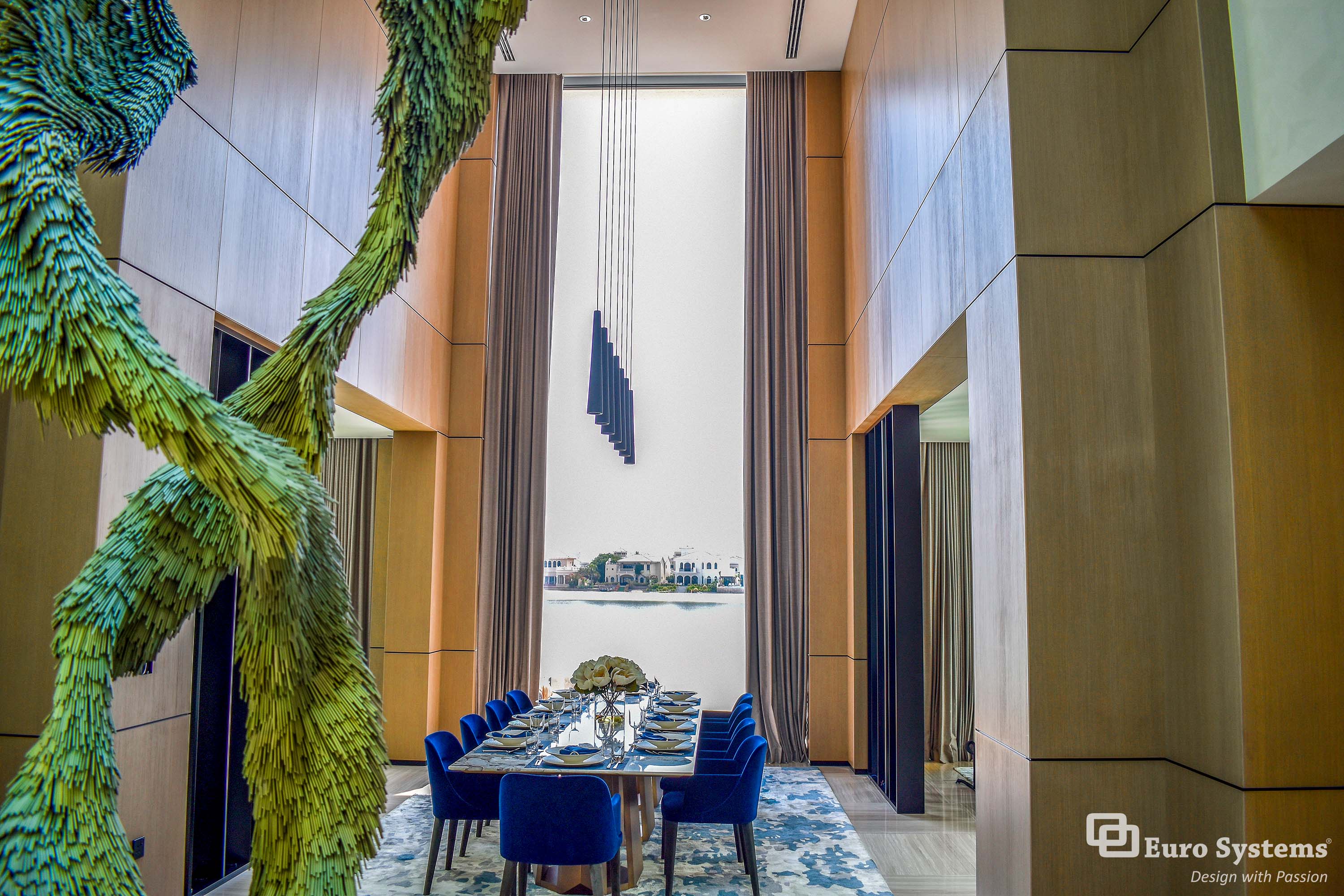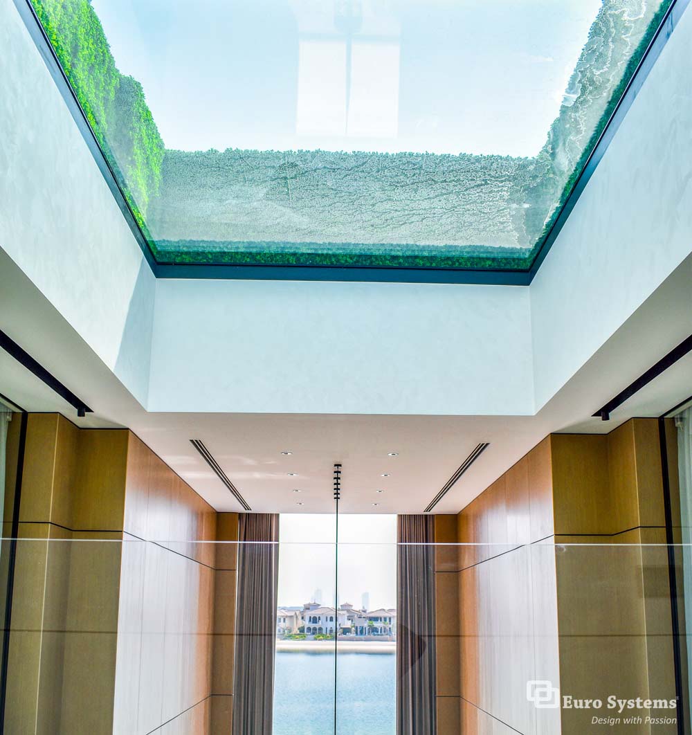 The stunning facade and bespoke features have been installed by Euro Systems® in this exceptional villa located on the prestigious district of Palm Jumeirah, Dubai, makes a strong impression from the moment you set eyes on the villa. Glass Type: DS 30 Grey + Extra Clear, RAL Colour: SDF 7021 SHR