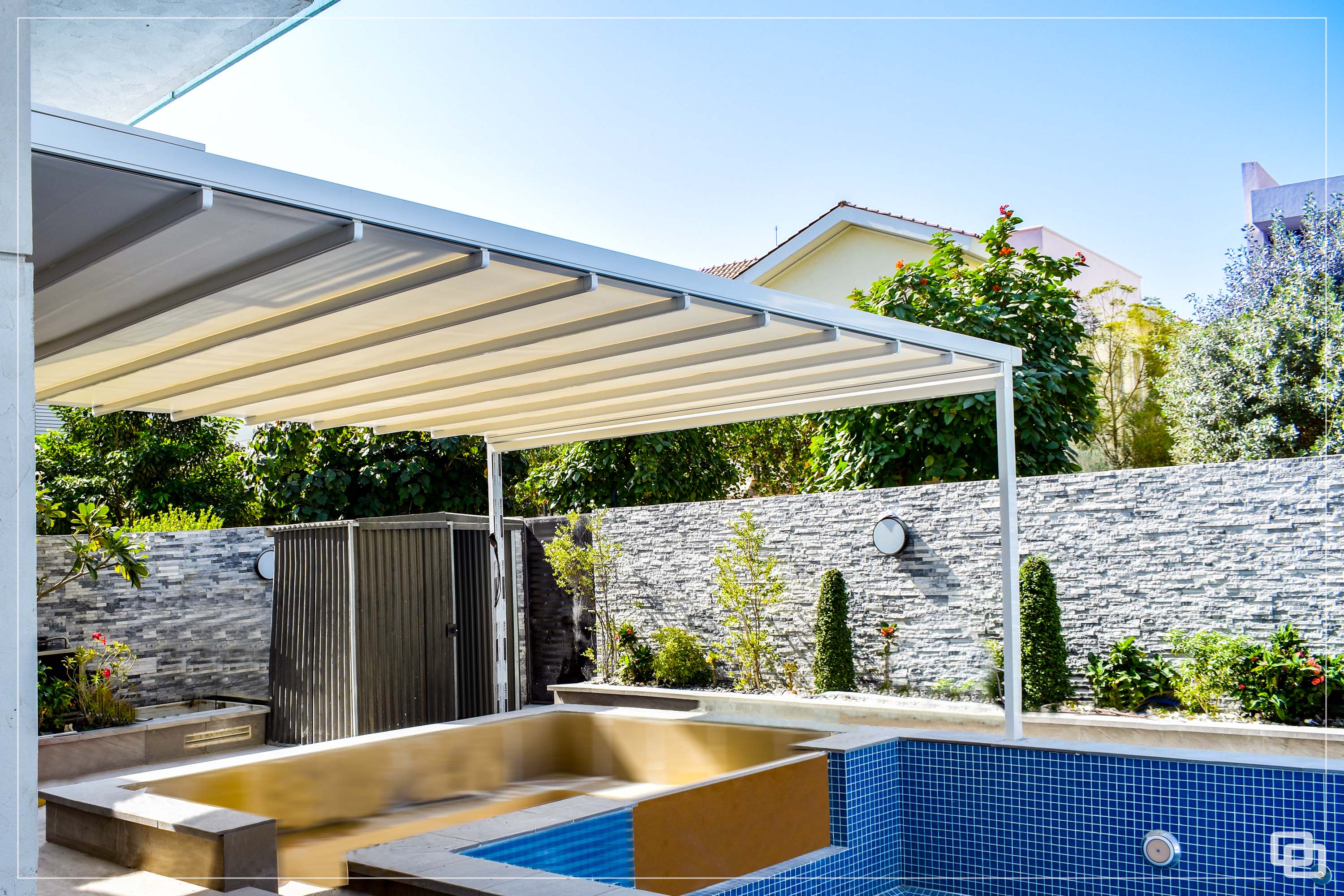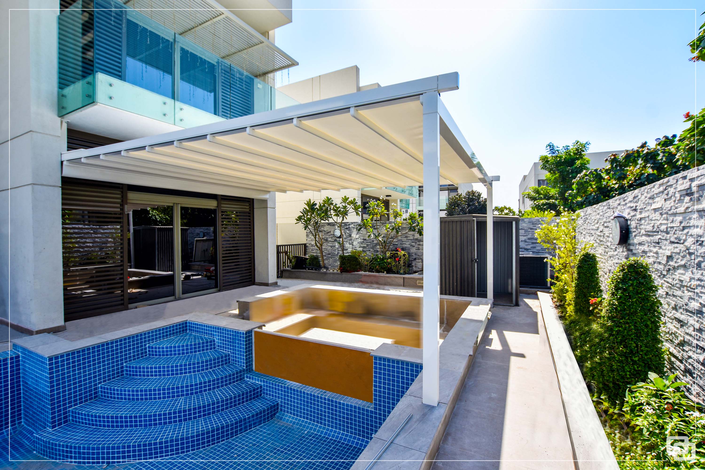This contemporary private villa is located in the upscale community of Meydan, Dubai. Our team installed Opus - Retractable Fabric Pergola.