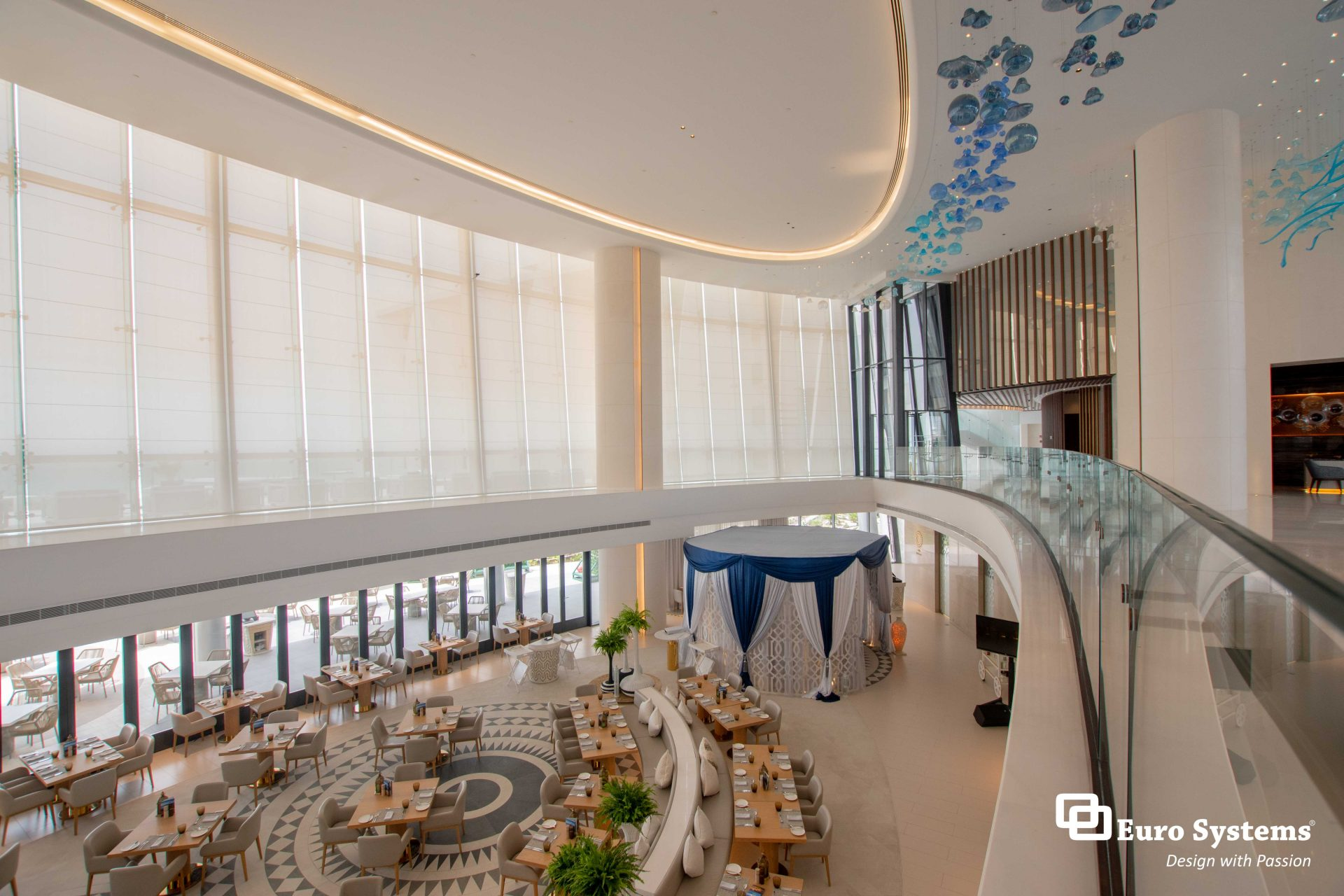 Serene Versante is a beachfront Signature Villa located on the Billionaires’ Row of Palm Jumeirah. The open-plan living spaces in this signature villa bestow the privilege of having Gracili Minimal Systems® installed to emit uninterrupted sea views, offering a high-luxury experience where every detail matters. Glass Type: DS 30 grey + Extra Clear, RAL Colour: SD 2901 Brass SHMS, Roller Blind Sunscreen Fabric : Cool View FD 03, Roller Blind Blackout Fabric : Opacus Alu 0763