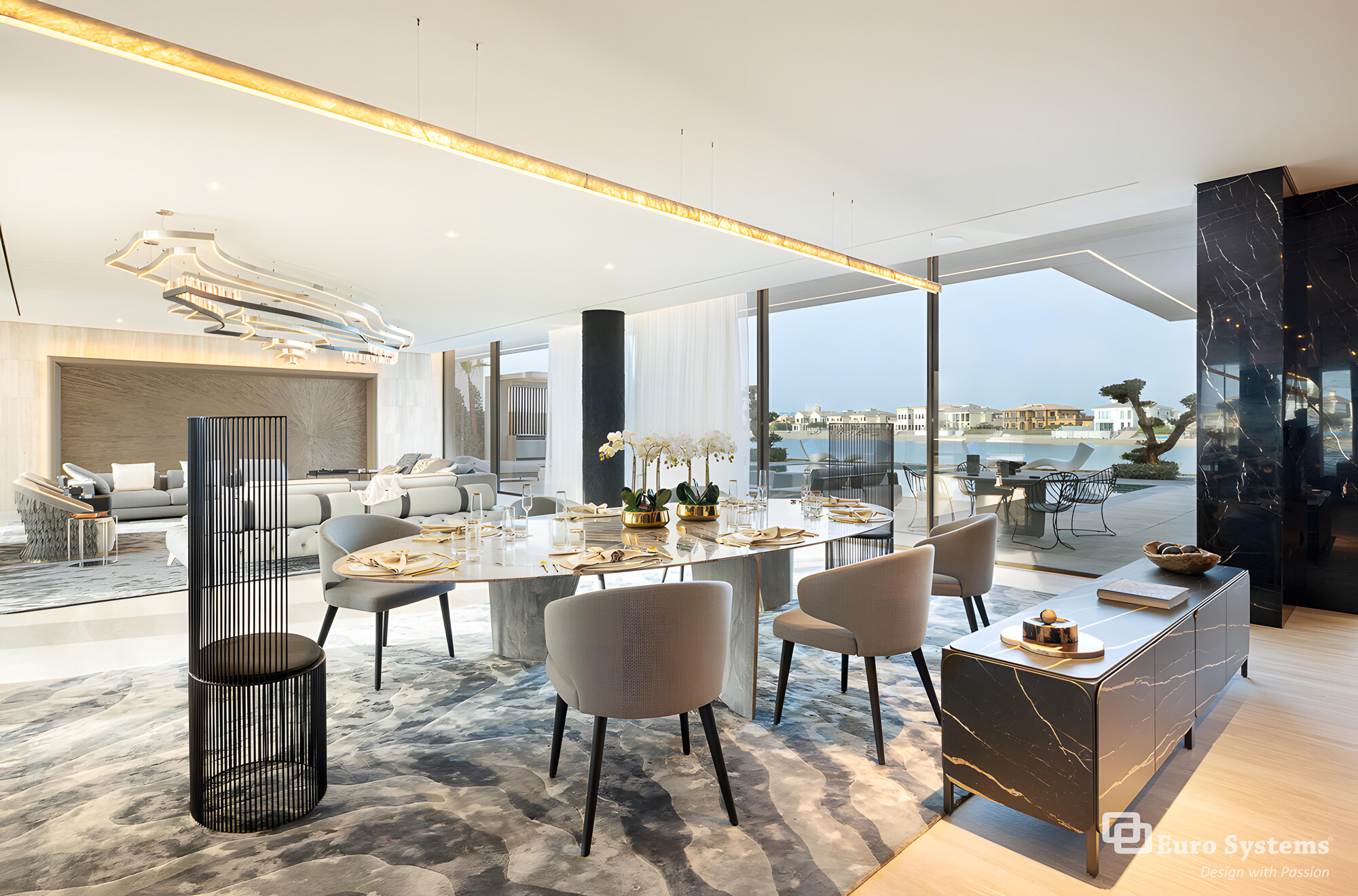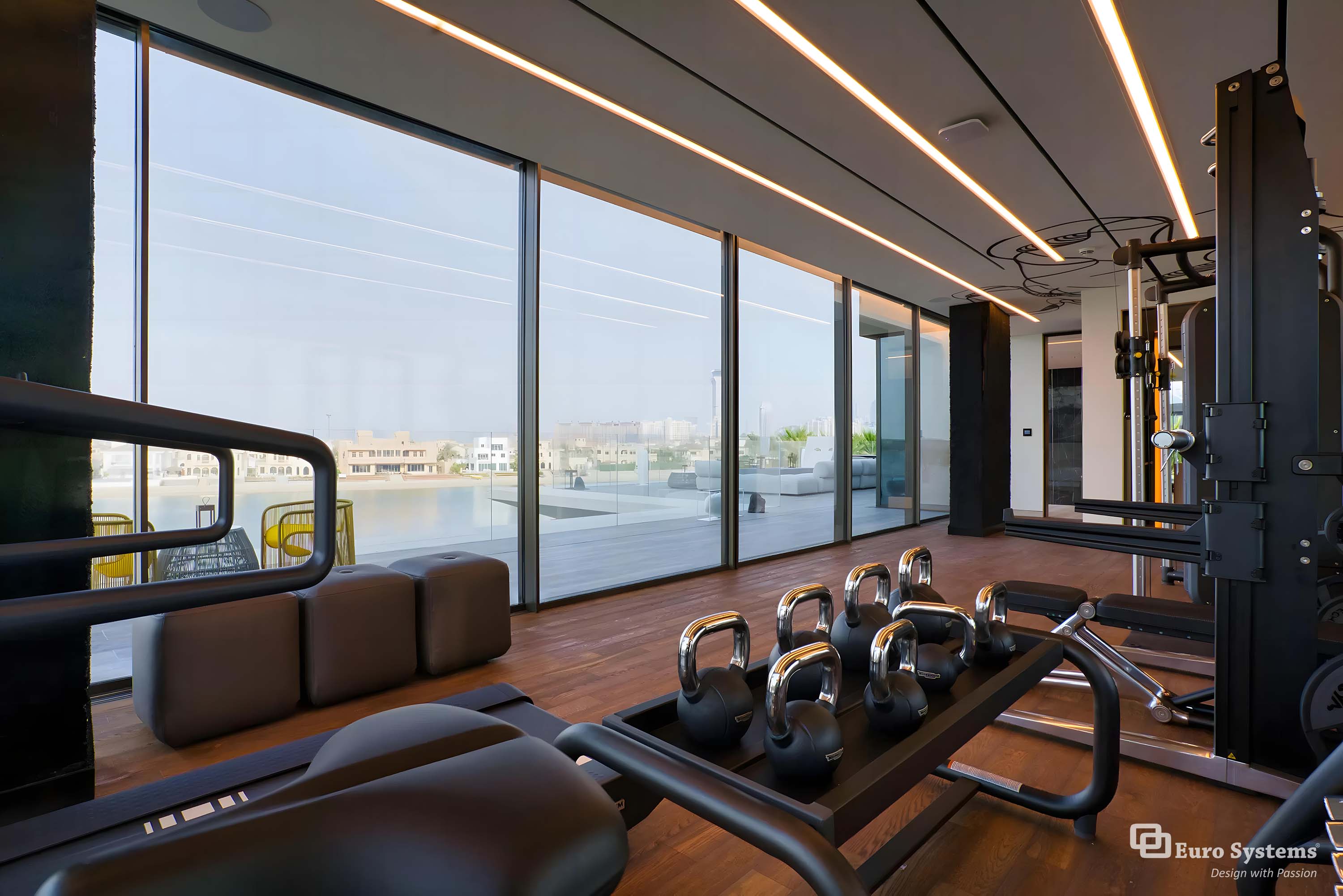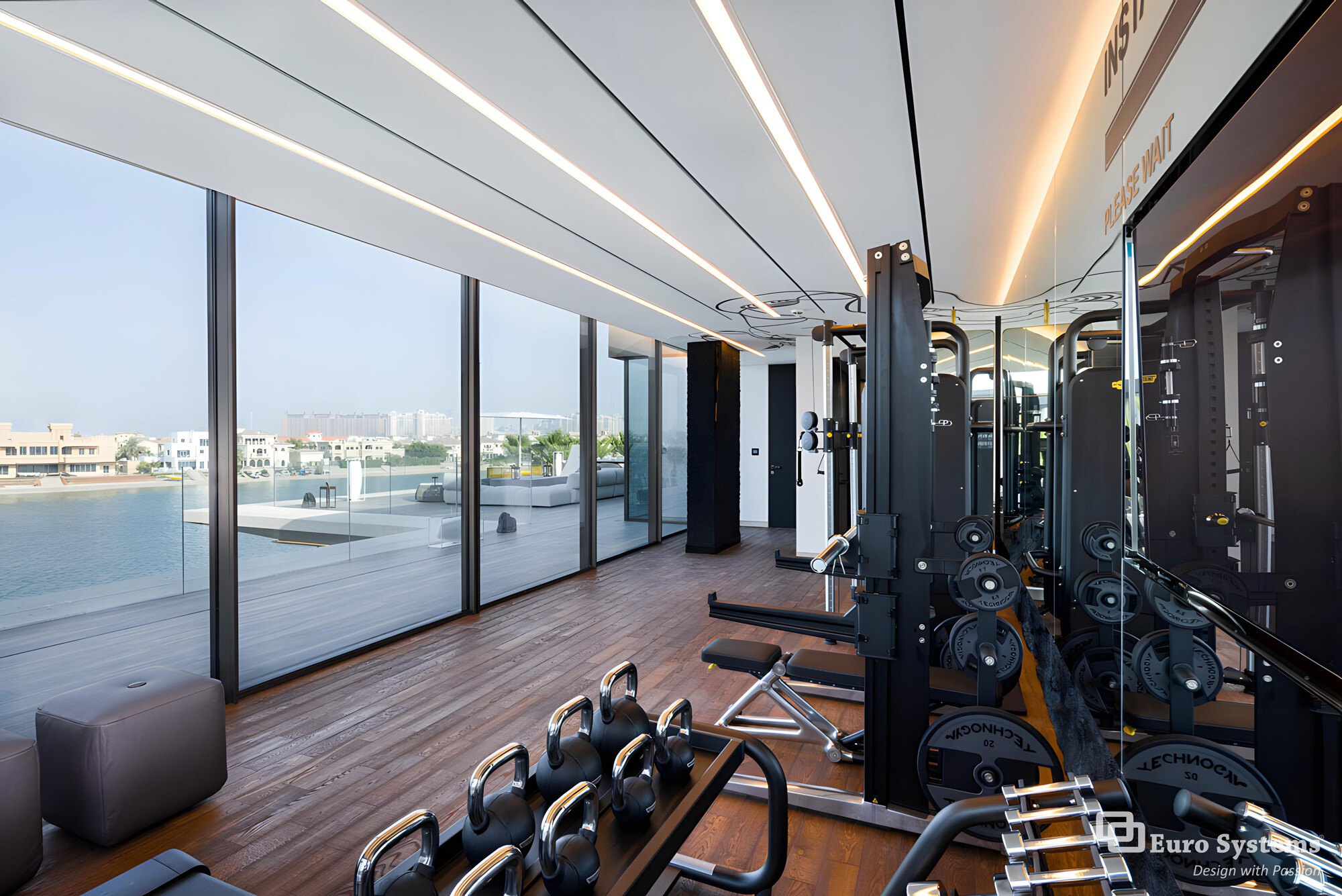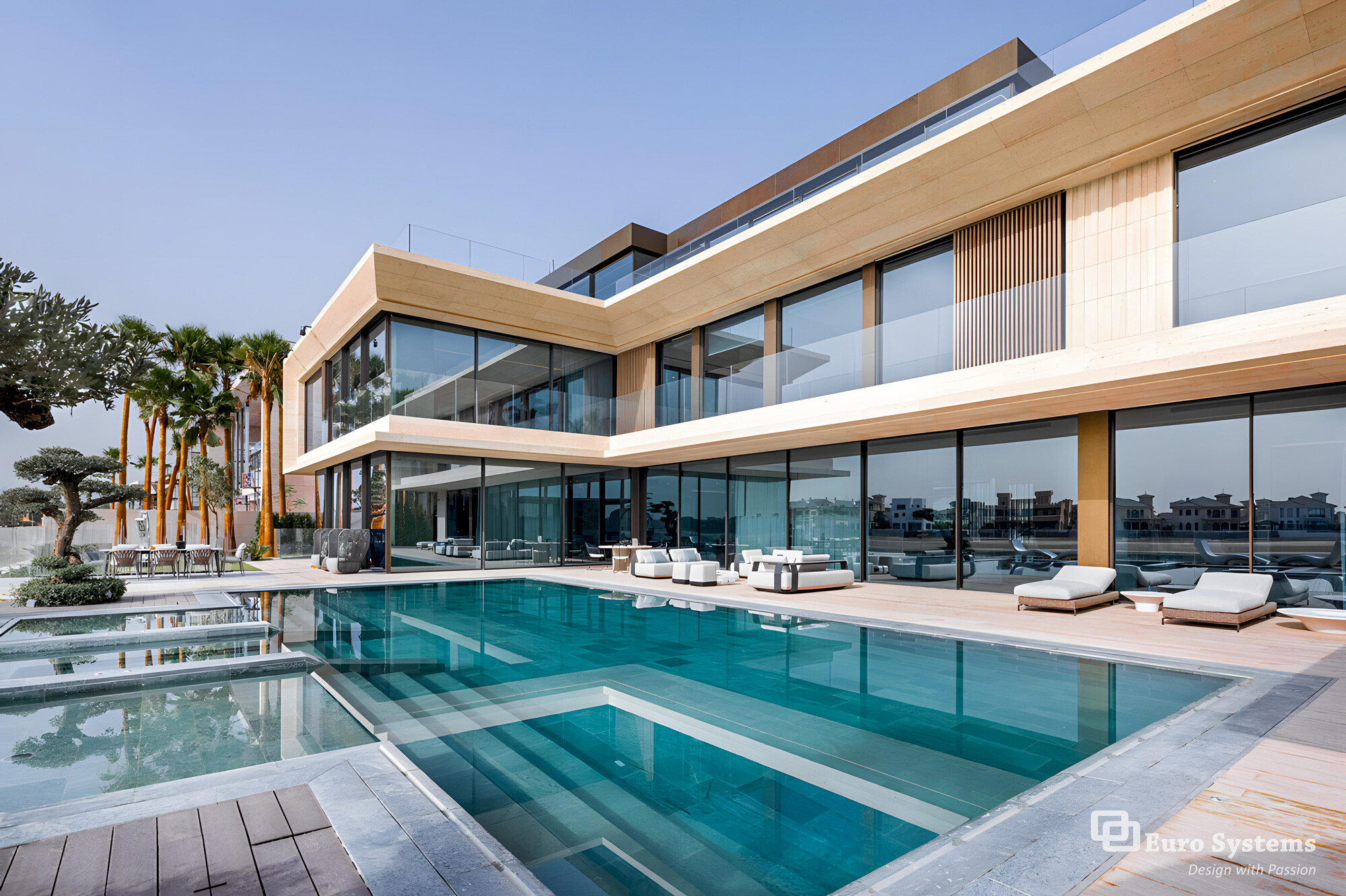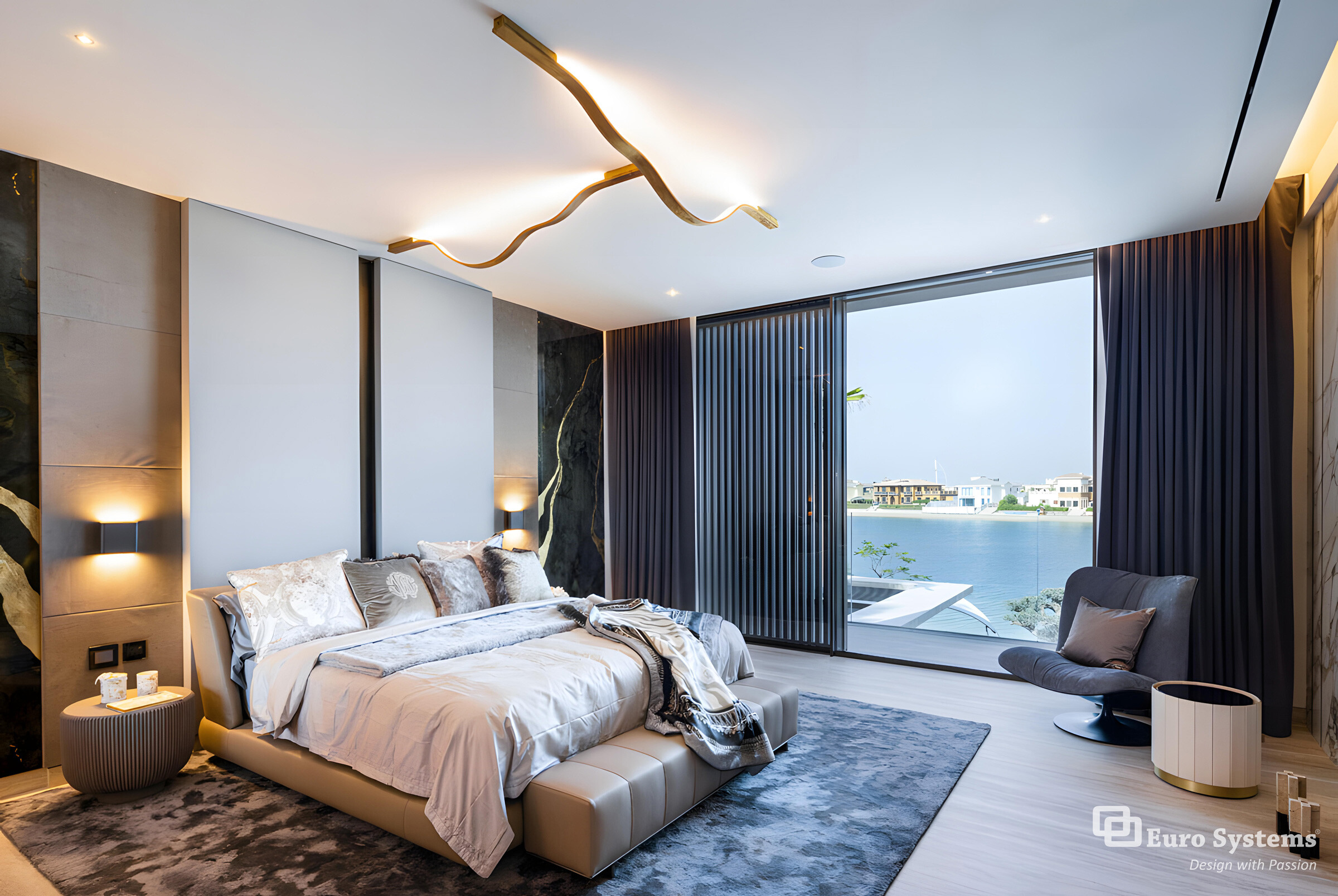 Serene Versante is a beachfront Signature Villa located on the Billionaires’ Row of Palm Jumeirah. The open-plan living spaces in this signature villa bestow the privilege of having Gracili Minimal Systems® installed to emit uninterrupted sea views, offering a high-luxury experience where every detail matters. Glass Type: DS 30 grey + Extra Clear, RAL Colour: SD 2901 Brass SHMS, Roller Blind Sunscreen Fabric : Cool View FD 03, Roller Blind Blackout Fabric : Opacus Alu 0763