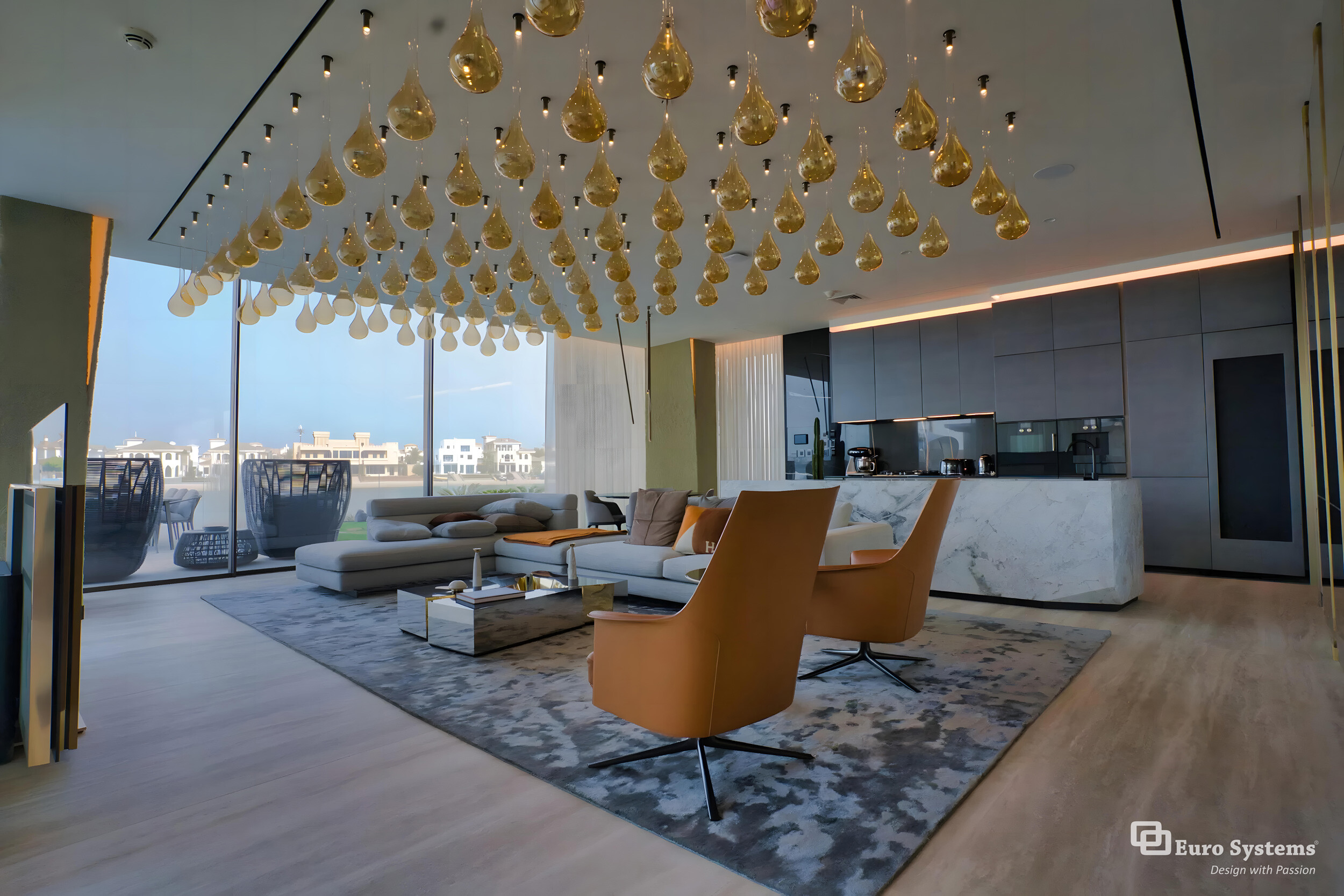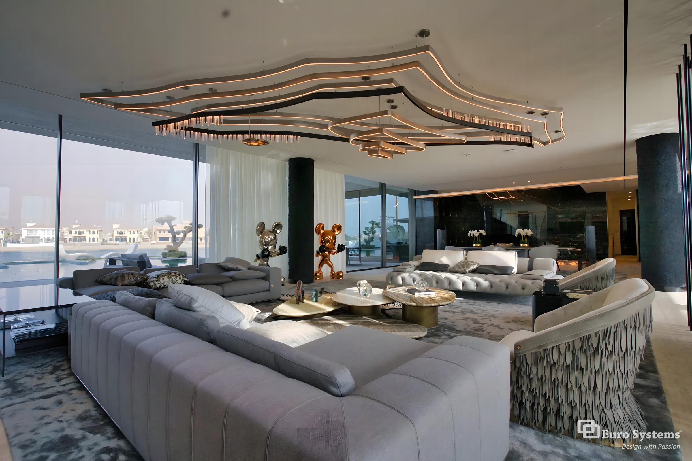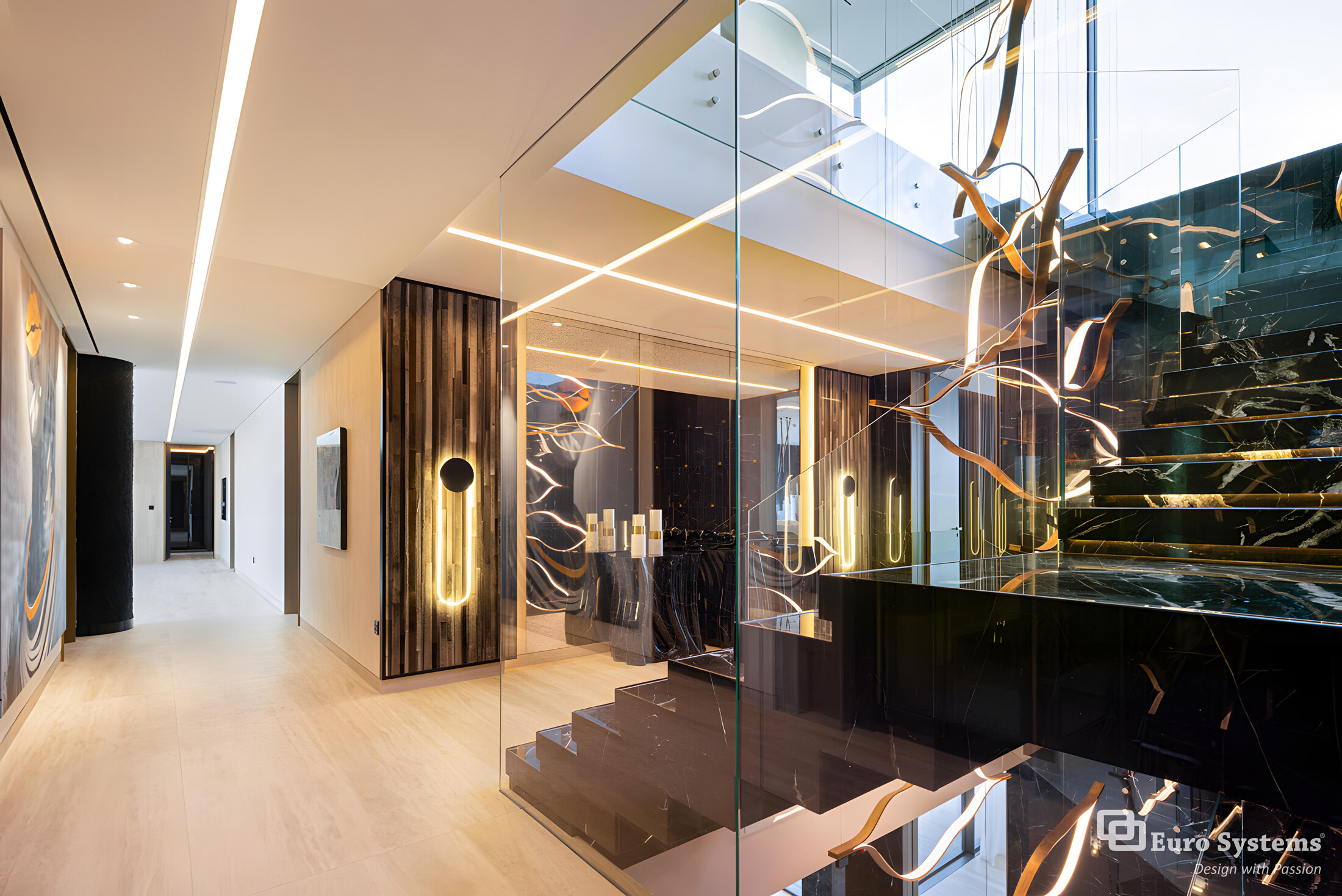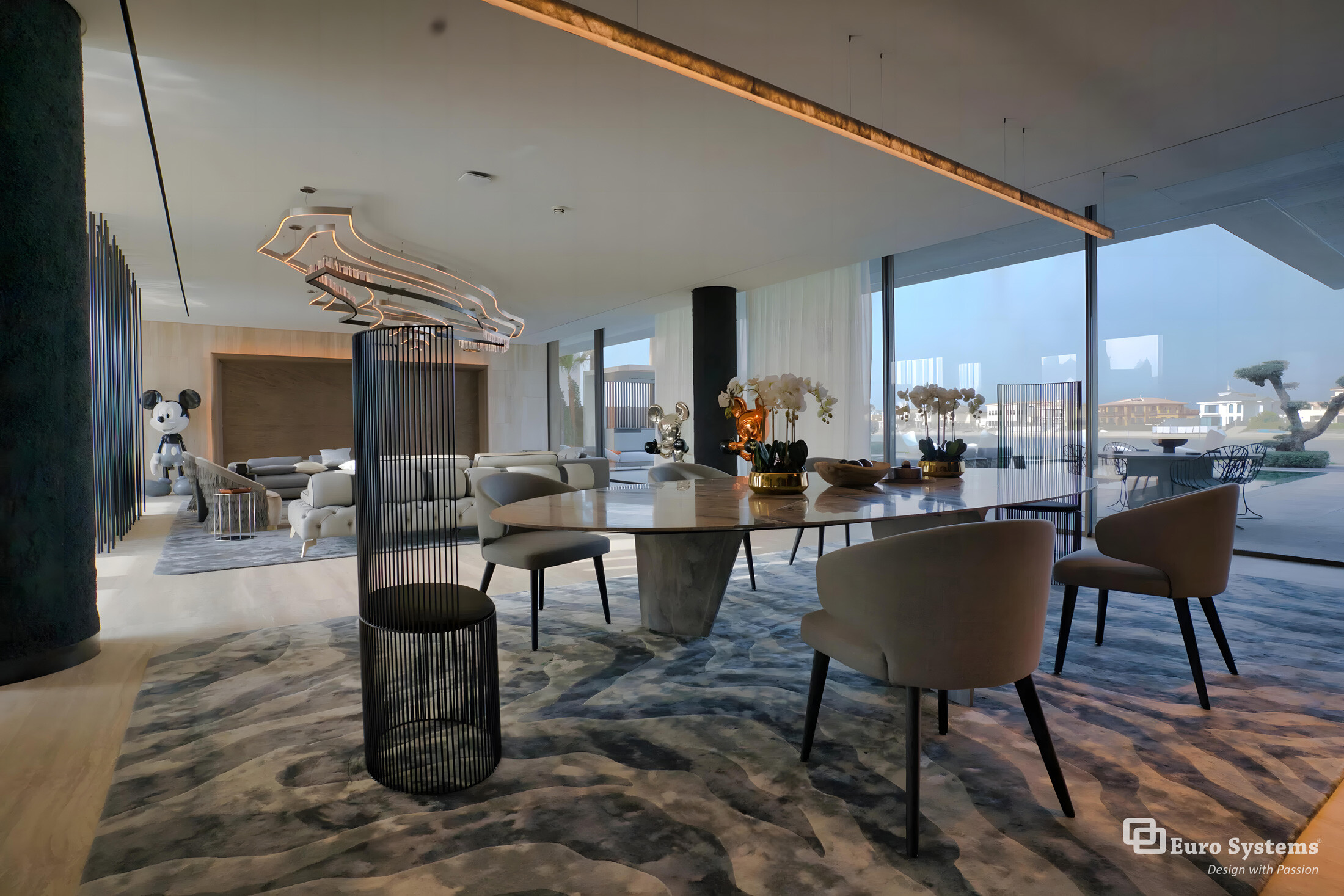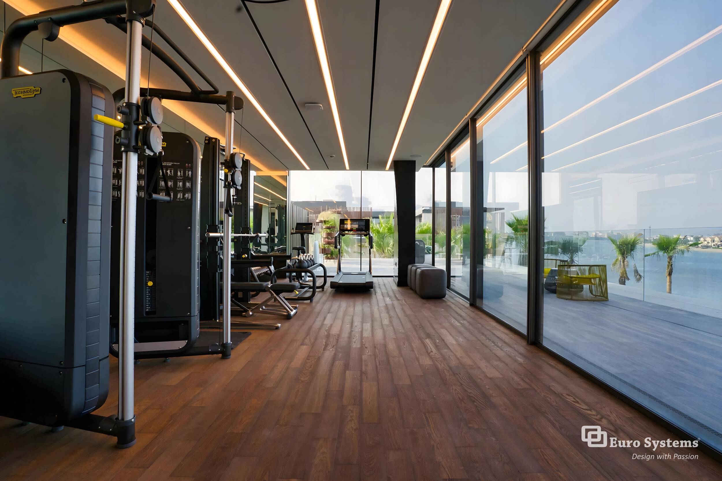 Serene Versante is a beachfront Signature Villa located on the Billionaires’ Row of Palm Jumeirah. The open-plan living spaces in this signature villa bestow the privilege of having Gracili Minimal Systems® installed to emit uninterrupted sea views, offering a high-luxury experience where every detail matters. Glass Type: DS 30 grey + Extra Clear, RAL Colour: SD 2901 Brass SHMS, Roller Blind Sunscreen Fabric : Cool View FD 03, Roller Blind Blackout Fabric : Opacus Alu 0763