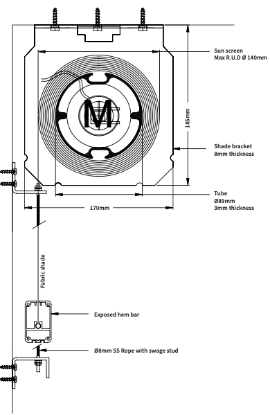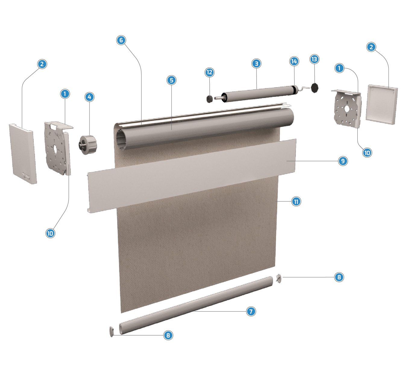 - Heavy duty VRS 230 VAC or SMI 230 VAC/24 VDC motor installed within the roller blind tube